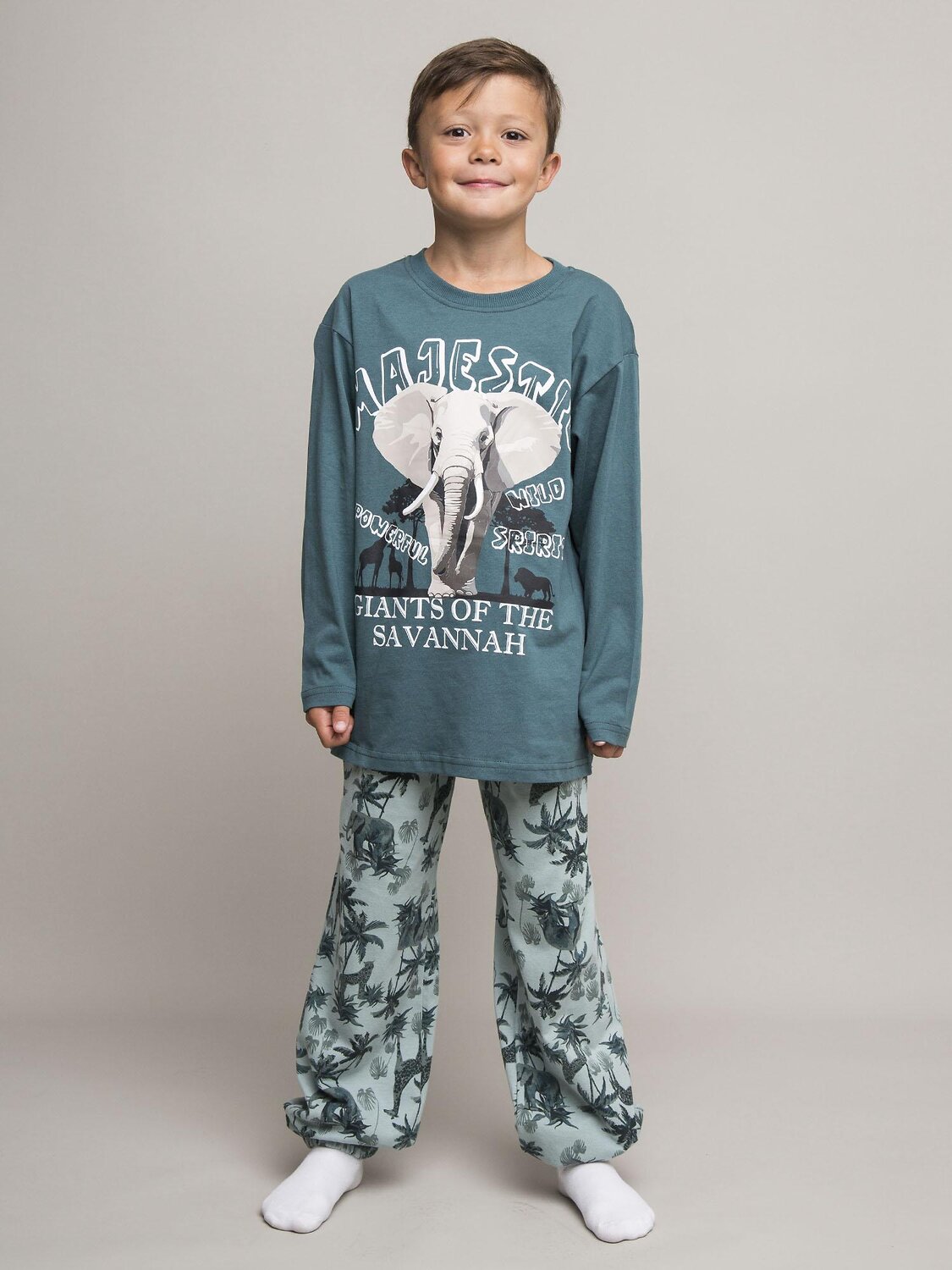 Детский пижамный комплект для мальчика из супрема пенье. Футболка зеленая с длинным рукавом и милым принтом в виде слона и надписями. Брюки со стильным тропическим принтом. Эластичная резинка на брюках для комфортного сна.