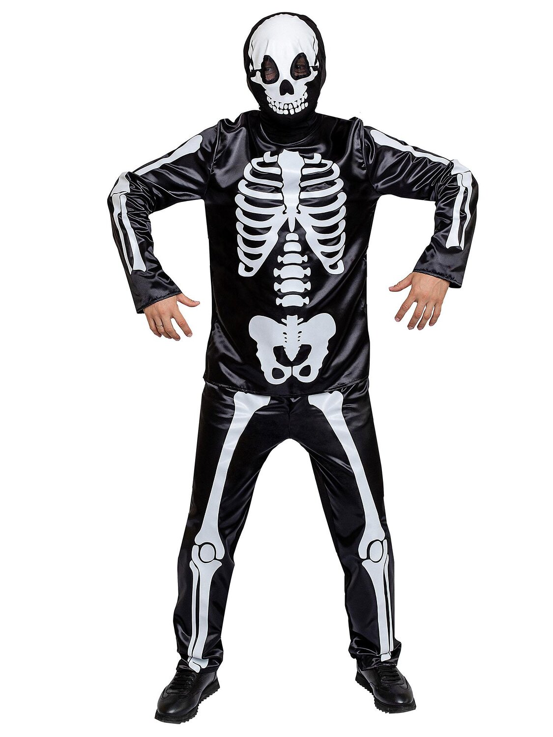 Карнавальный костюм Скелета для взрослых на Хэллоуин. В комплект костюма входят: рубашка, брюки, маска, перчатки. Костюм имеет яркий принт в виде костей скелета. Подойдет для вечеринок и выступлений, поможет создать качественный и жуткий образ к Хэллоуину. Материал - полиэстер и хлопок.