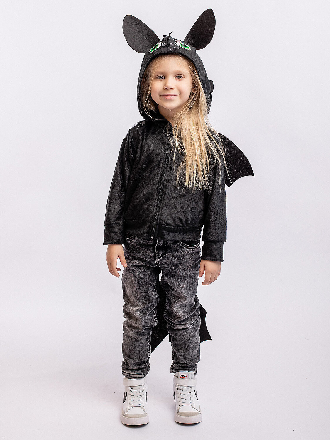 Карнавальный костюм Дракоша детский черный. Представлен в виде худи с капюшоном на молнии. Крылья и хвост съемные на застежке велкро, по бокам есть карманы. В капюшоне хлопковый подклад.