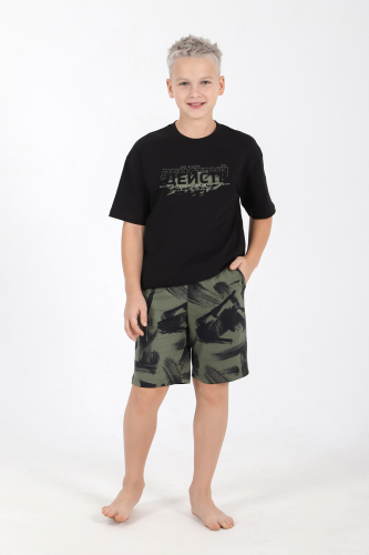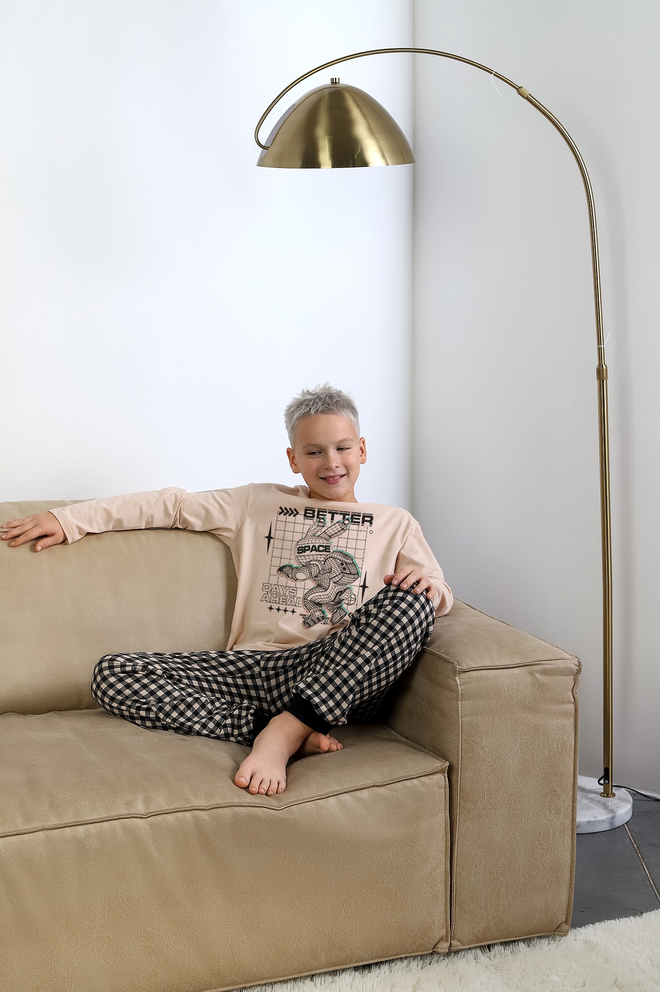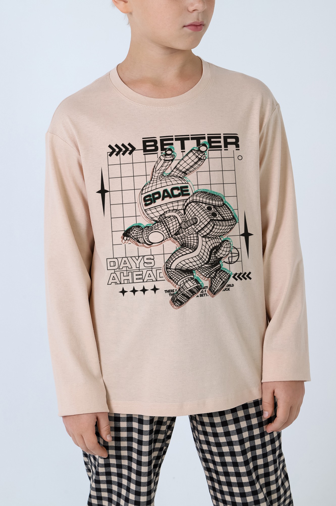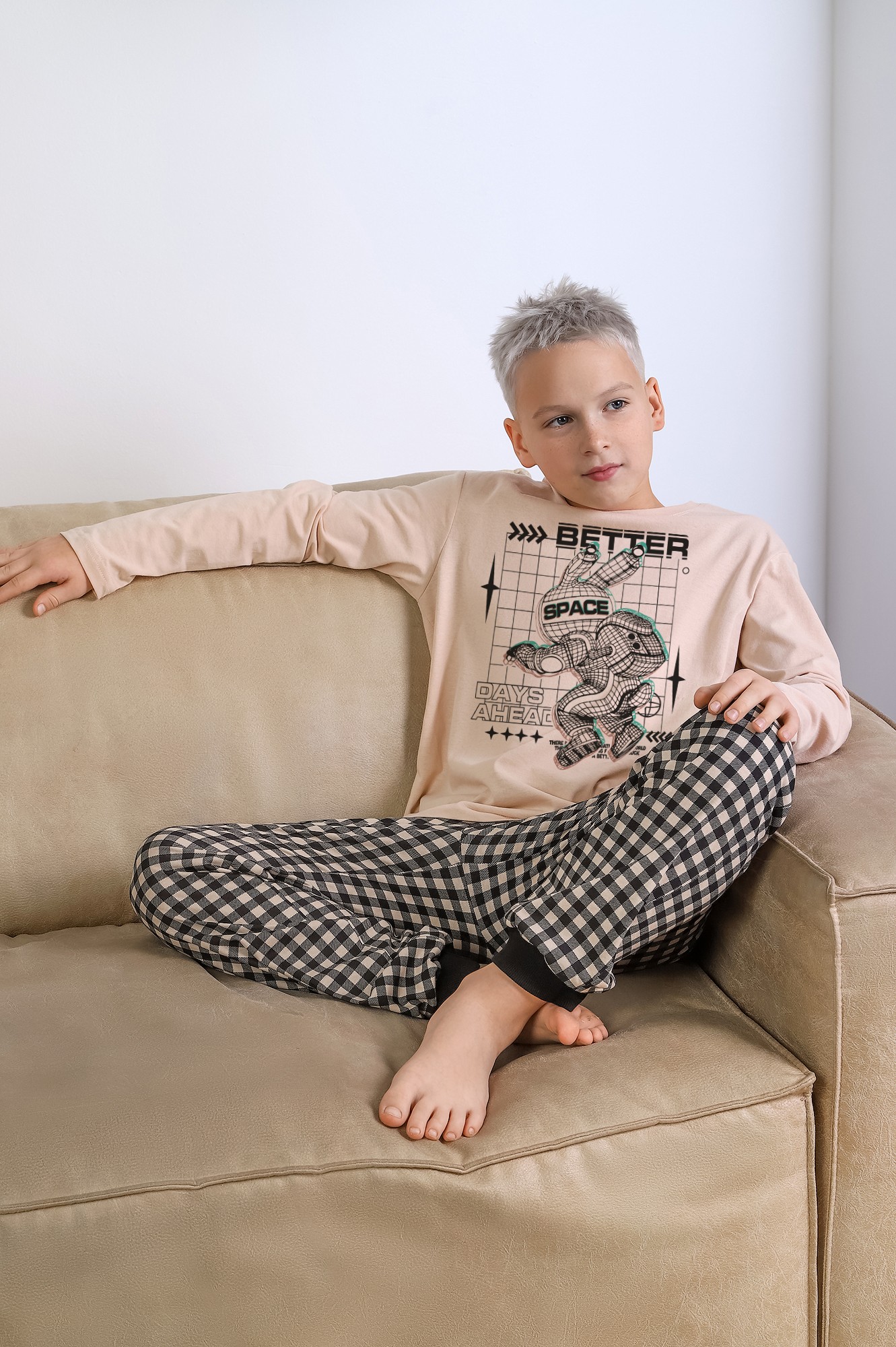 Пижама для мальчика, состоящая из футболки и брюк. Футболка - из гладкокрашеного трикотажного полотна "кулирка", классического покроя: с длинными втачными рукавами, горловиной овальной формы, обработанной втачной планкой и принтом в центре переда, выполненным в технике шелкографии. Брюки - из трикотажного полотна "кулирка" в клетку, длинные, с эластичной тесьмой на поясе и притачными манжетами из полотна "кашкорсе" черного цвета.