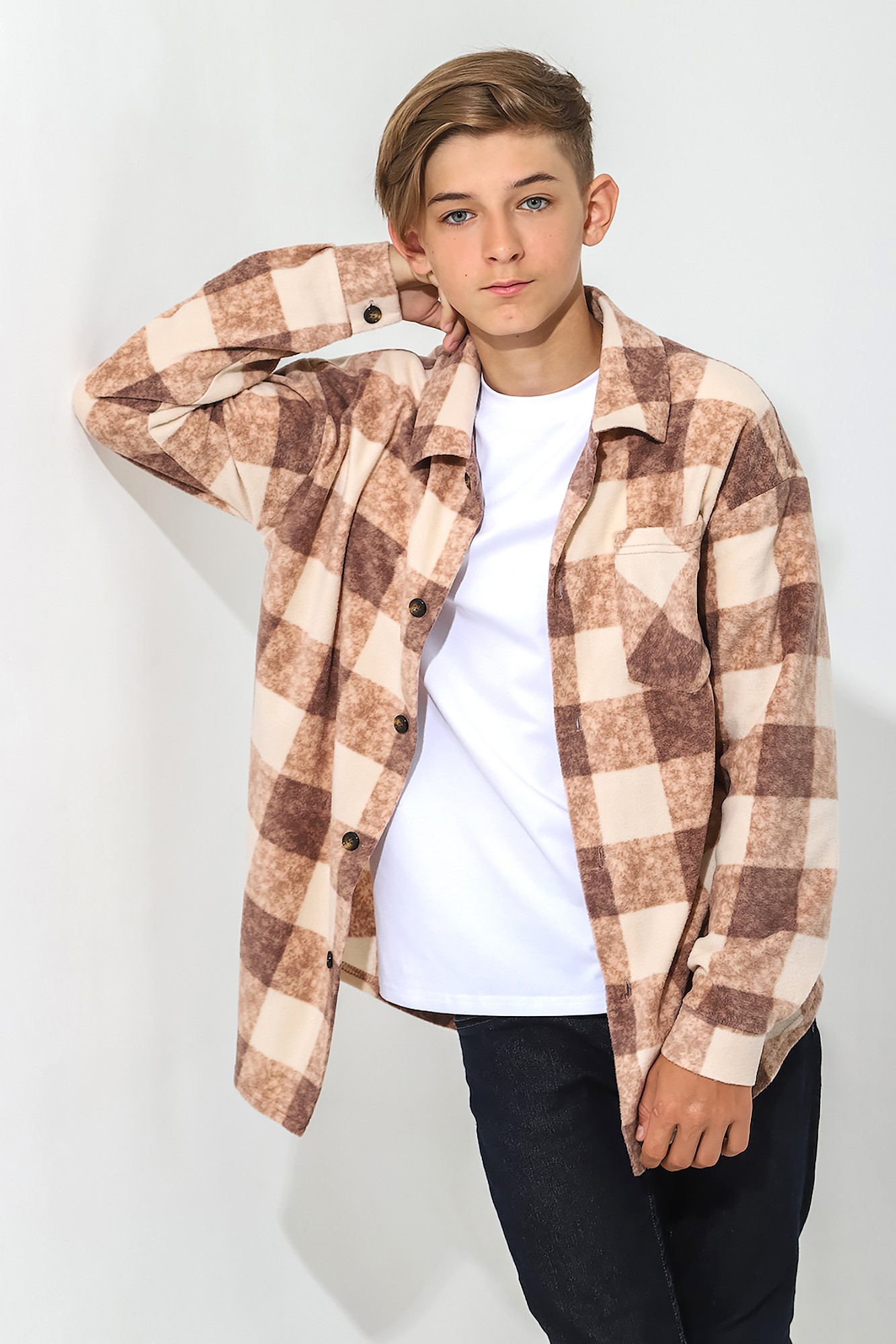 Актуальная рубашка для мальчика. Модель из клетчатого легкого флиса в объеме оверсайз, на пуговицах, с накладным карманом, фигурной линией низа.