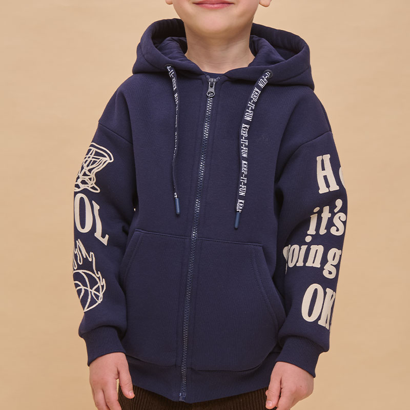 Состав: 80%хлопок 20%полиэстерОписание: Худи зипка для мальчиков. Трикотажная куртка оверсайз из футера с начёсом — отличная альтернатива ветровке в прохладную погоду. Толстовка детская застёгивается на центральную молнию. В составе ткани преобладает хлопок — зипка мягкая, приятная на ощупь и хорошо пропускает воздух. Полиэстер обеспечивает изделию прочность и долговечность. Регулируемый капюшон и манжеты из эластичной рибаны по рукавам и низу защитят от холода и ветра. По переду куртка детская дополнена объёмными накладными карманами. Зипка — базовый элемент для детского и подросткового гардероба. Легко сочетается с джинсами, спортивными брюками и брюками карго. Толстовка для мальчика на молнии декорирована графичными монохромными принтами в университетском стиле по рукавам. Принты эластичные и стойкие, без проблем переносят частные стирки. Стильная и практичная худи на молнии для мальчика неприхотлива в уходе. Помните о правильном уходе за изделием: рекомендуется стирать при температуре не выше 30 °C, без предварительного замачивания, с изнанки. Это поможет сохранить качество и цвет куртки на длительное время. Не забывайте о выборе правильного размера. Используйте таблицу размеров на фотографии, чтобы выбрать подходящий вариант для вашего мальчика. Обратите внимание, что цвет товара на экране вашего устройства может отличаться от реального.