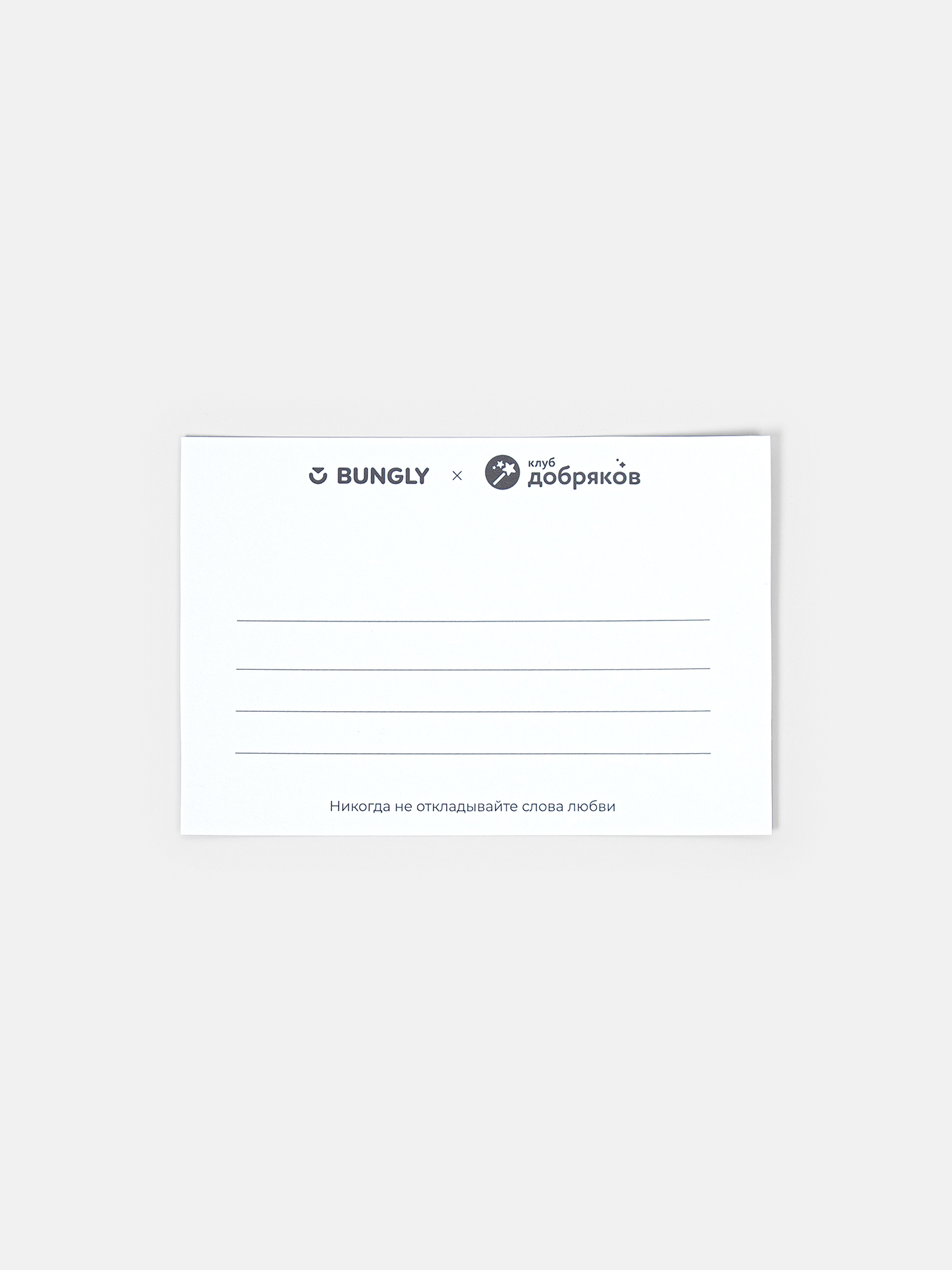 Серия благотворительных открыток «Никогда не откладывайте слова любви» – это результат совместной работы бренда Бангли, фонда «Клуб Добряков» и талантливых художников, каждый из которых, вложил в свою работу идею. Эта открытка –напоминание, что любовь уже живёт в нас: тихая, простая и искренняя.