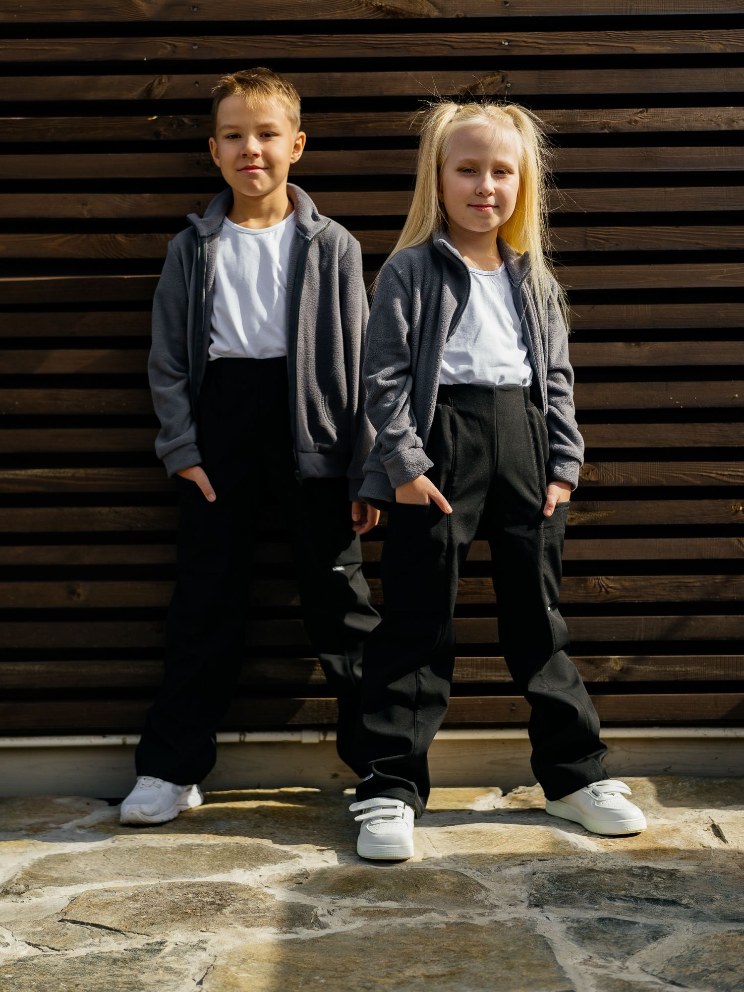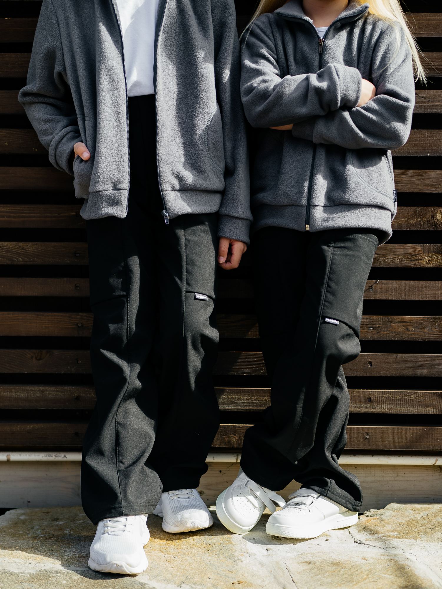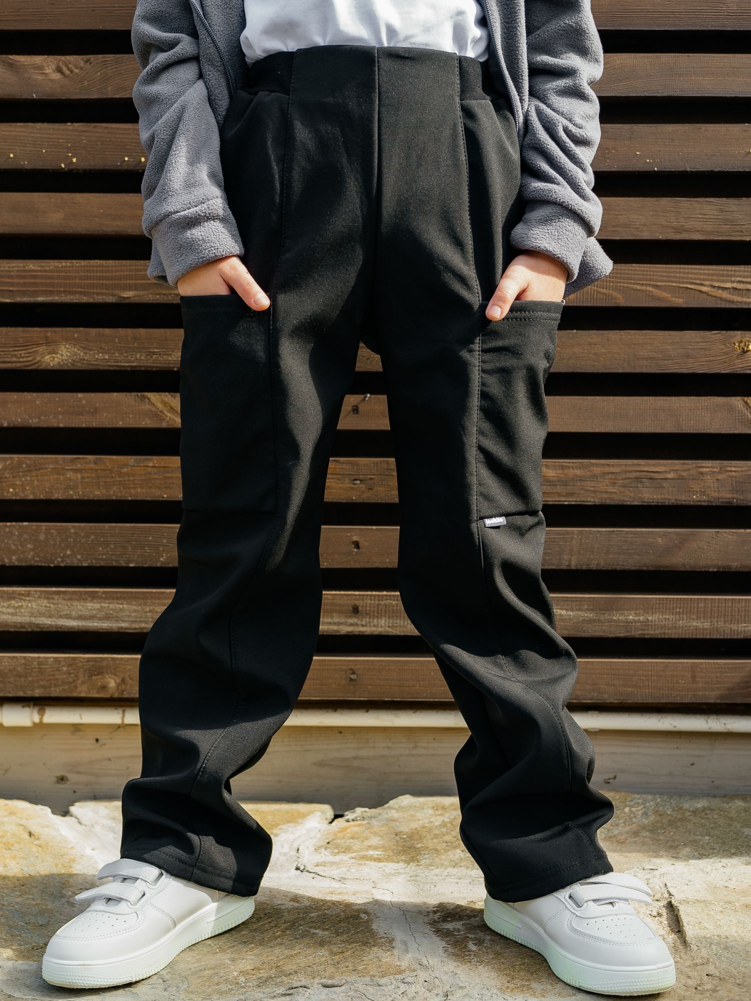 Брюки прямого силуэта из мембраны с флисовой подкладкой черного цвета . Мембранное покрытие обеспечивает сохранение тепла и воздухообмен . Передние и задние половинки брюк с рельефами, в рельефные швы вставлены вместительные карманы , рельефы отстрочены отделочной строчкой. Пояс составной - передняя часть из основного материала, боковая и задняя часть пояса - из кашкорсе. Низ брюк прямой.