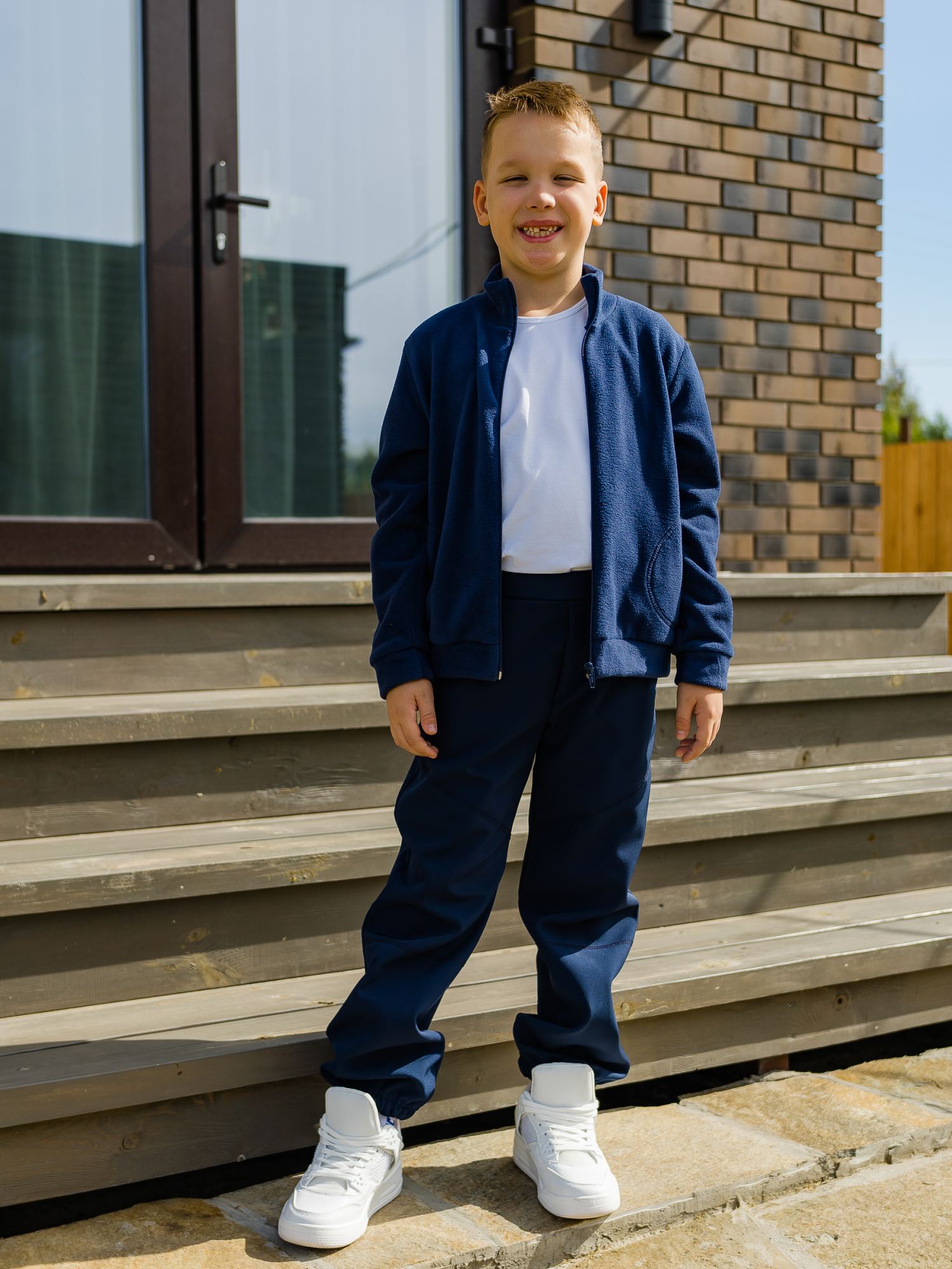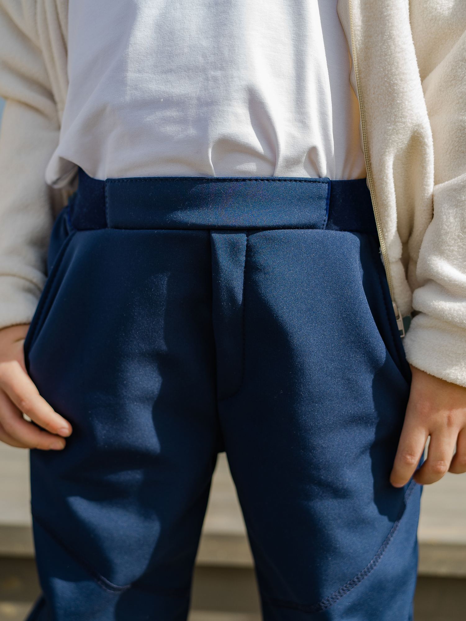 Брюки прямого силуэта из мембраны с флисовой подкладкой темно-синего цвета . Мембранное покрытие обеспечивает сохранение тепла и воздухообмен. Передние половинки брюк украшены отделочными строчками и имитацией гульфика. Брюки с боковыми карманами. Задняя часть брюк на кокетке. Пояс составной - передняя часть из основного материала, боковая и задняя часть пояса из кашкарсе, в поясе предусмотрен шнурок для регулирования по объему талии.. Низ брюк на эластичной резинке.