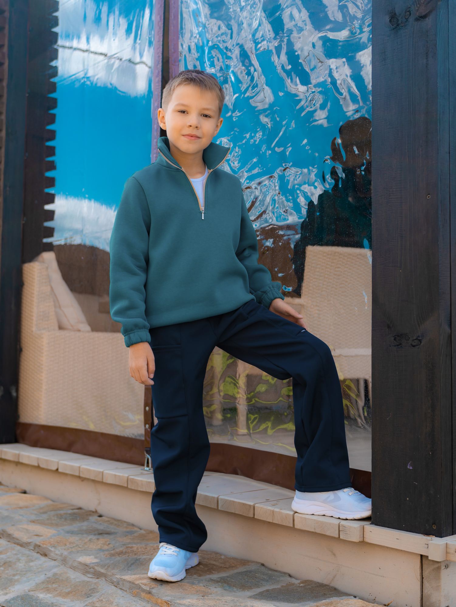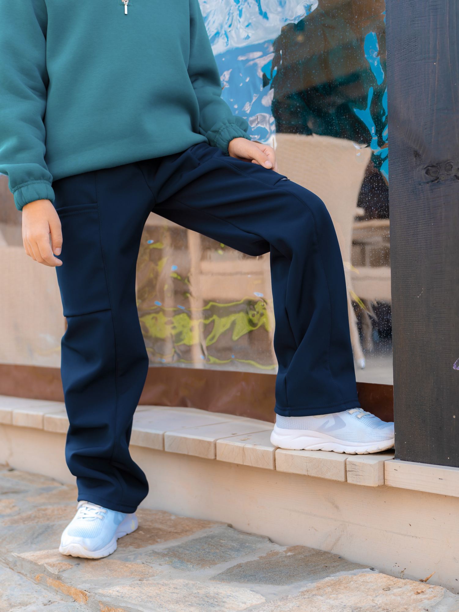 Брюки прямого силуэта из мембраны с флисовой подкладкой темно-синего цвета . Мембранное покрытие обеспечивает сохранение тепла и воздухообмен . Передние и задние половинки брюк с рельефами, в рельефные швы вставлены вместительные карманы , рельефы отстрочены отделочной строчкой. Пояс составной - передняя часть из основного материала, боковая и задняя часть пояса - из кашкорсе. Низ брюк прямой.