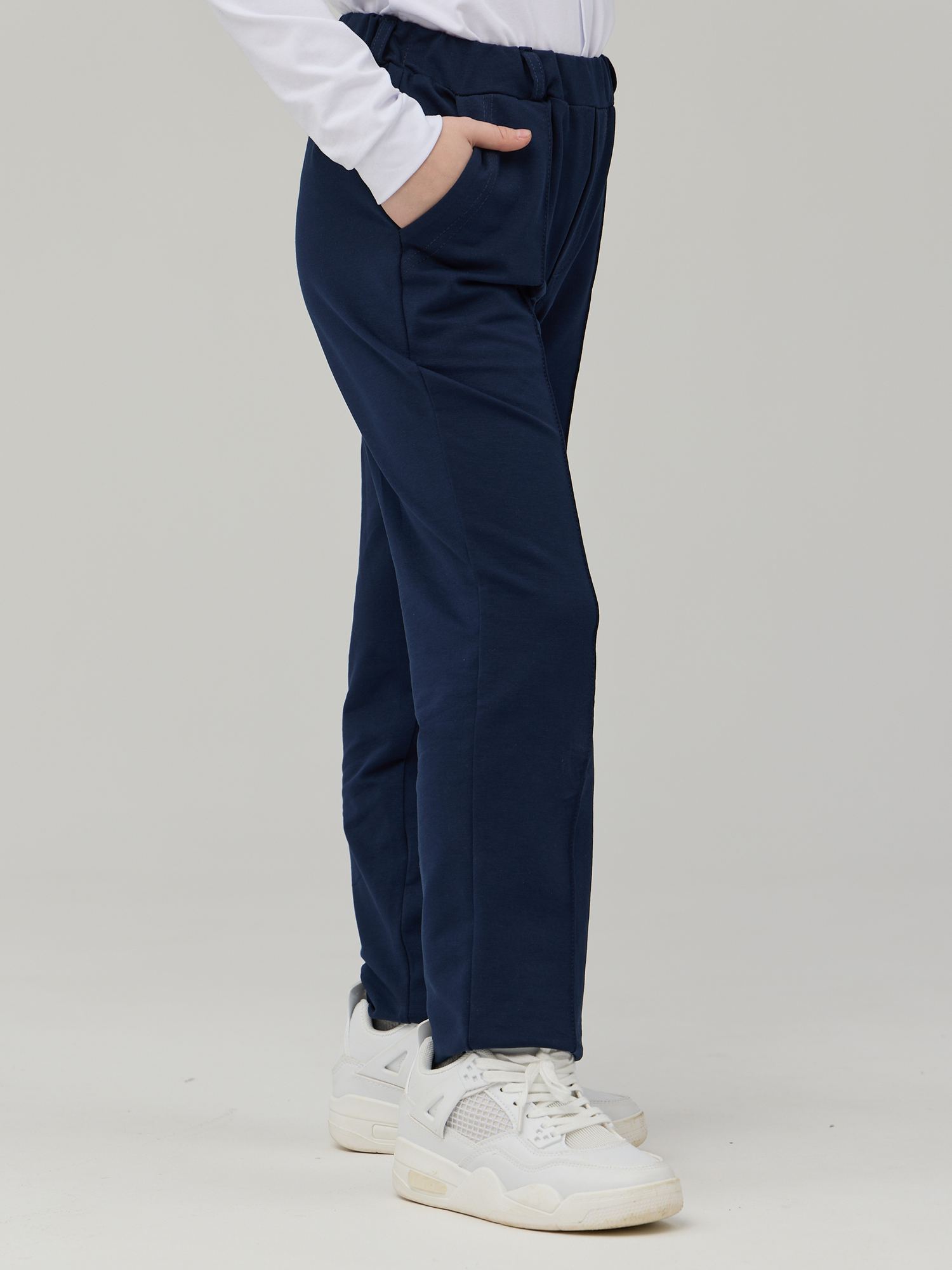Школьные брюки "унисекс" из футера темно-синего цвета прямого силуэта с боковыми карманами и имитацией гульфика . Детские брюки выполненые из трикотажа премиального качества - ПЕНЬЕ, с содержанием хлопка 92% .Брюки очень комфортны - без молнии и пуговиц, на эластичном поясе. Брюки на резинке не давят на живот, их легко снимать, переодеваясь на физкультуру. Трикотажные брюки имеют застроченные складки - Вам не придется каждый вечер отглаживать стрелки. Классические брюки при необходимости можно носить с ремнем, для этого на поясе имеются шлевки. Трикотажные хлопковые штаны приятны к телу, в них Вашему ребенку не будет жарко целый день сидеть за партой, а также они очень легки в уходе. Детские брюки идеально подойдут как для непоседливых учеников начальных классов, так и для страшеклассников, Трикотаж не мнётся и хорошо сохраняет форму при длительной носке. Изделие выполнено из трикотажа премиального качества - ПЕНЬЕ, с содержанием хлопка более 92%