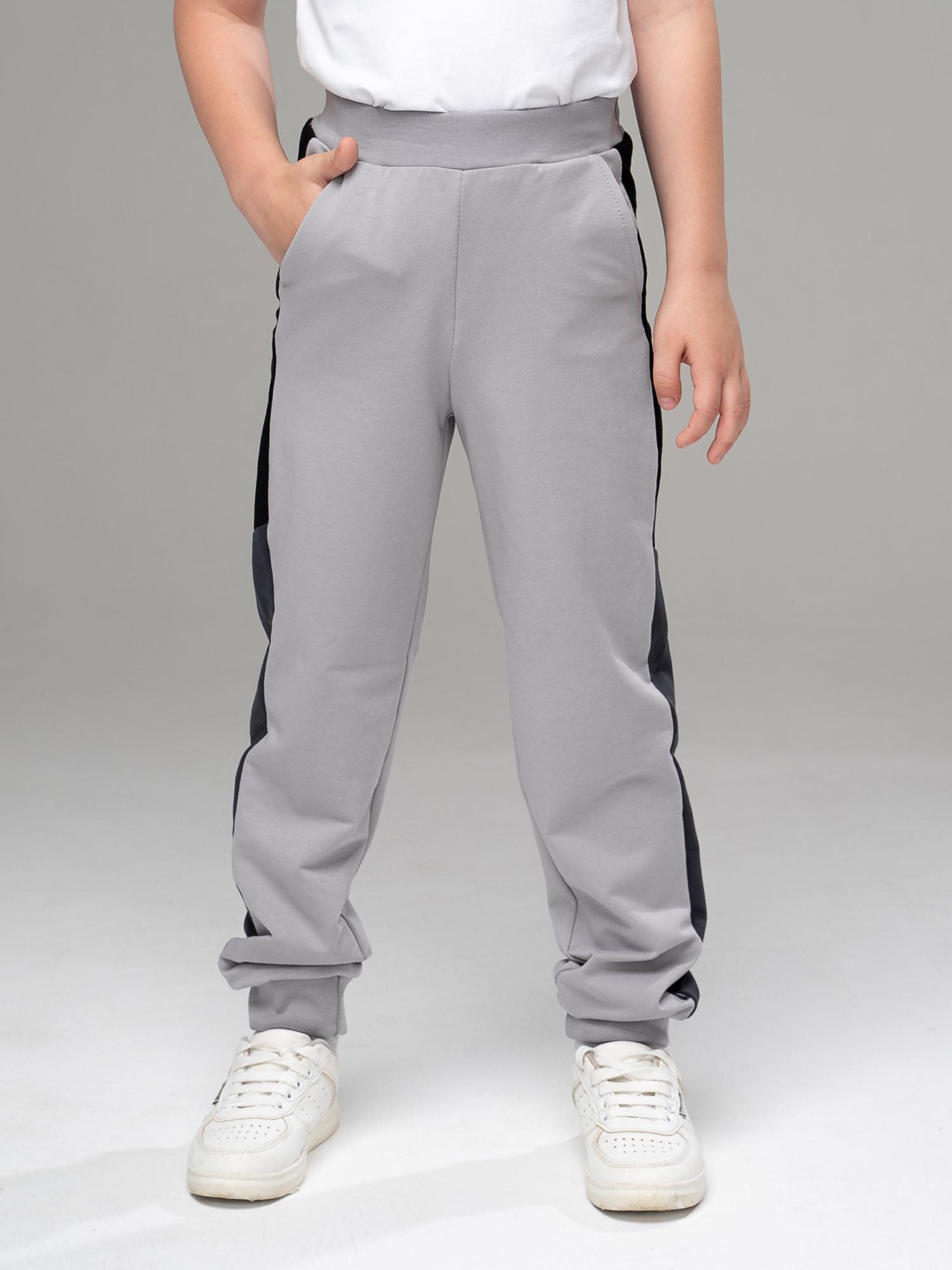Спортивные брюки из футера серого цвета , слегка зауженного силуэта с боковыми карманами и широкими лампасами из отделочного полотна двух цветов. Пояс на эластичной резинке. Низ брюк на манжетах. Изделие выполнено из трикотажа премиального качества - ПЕНЬЕ, с содержанием хлопка более 92%