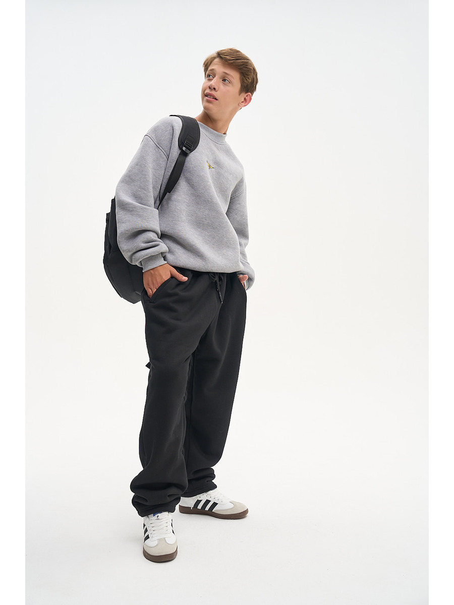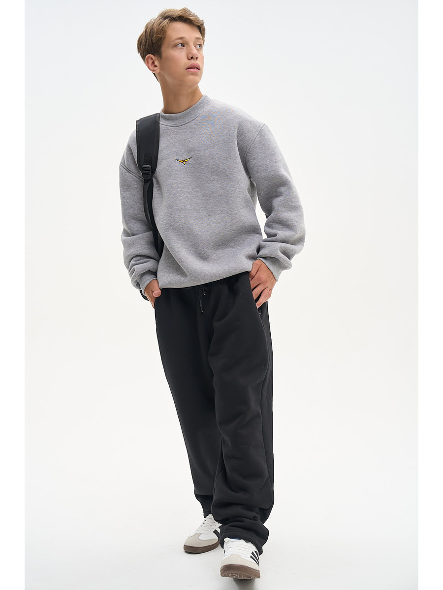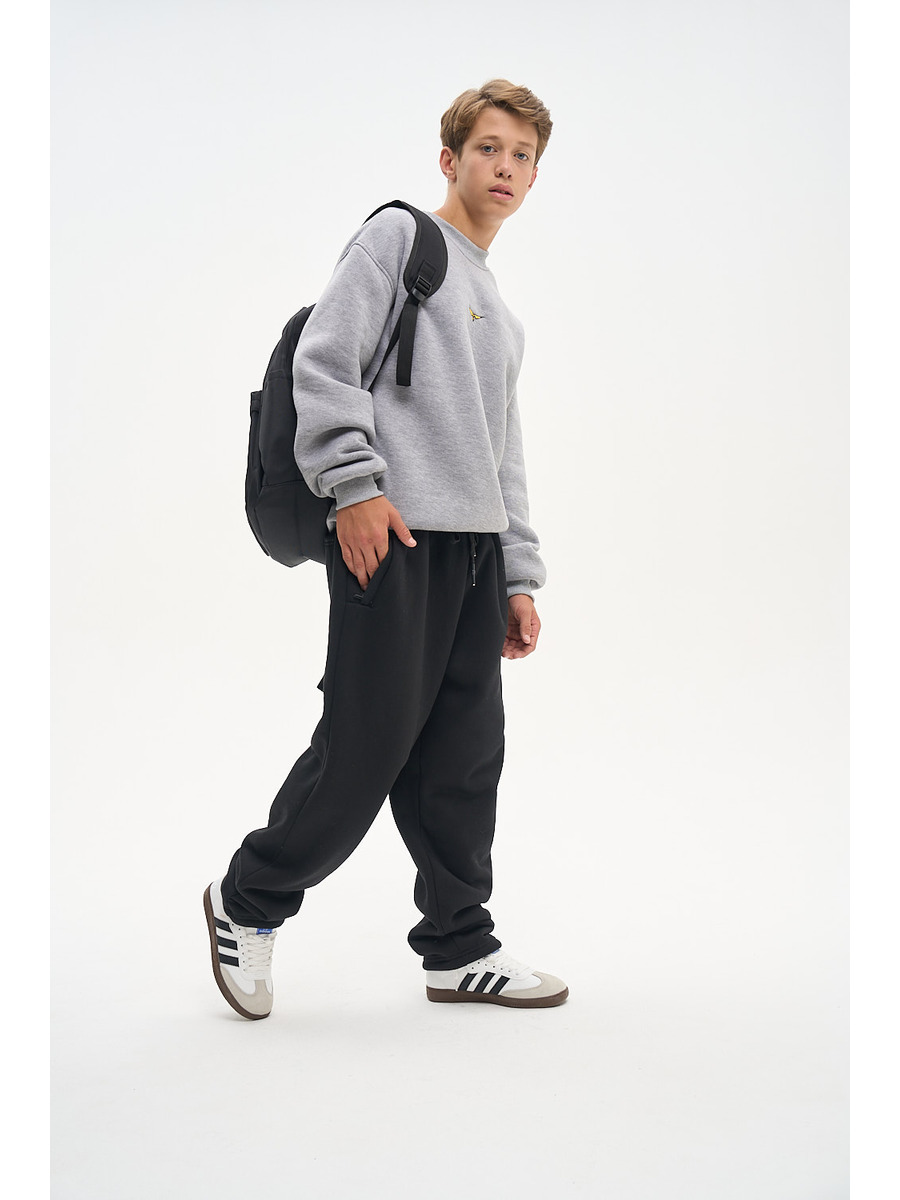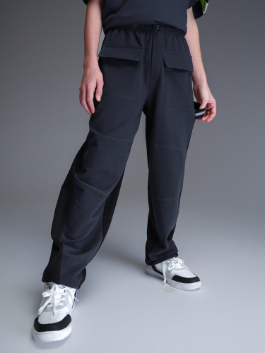 Брюки для мальчика из теплого мягкого трикотажа с искусственным мехом внутри. Вместительные боковые карманы на молнии. Пояс из мягкой эластичной резинки на регулируемом шнурке. Отверстия для шнурка укреплены и украшены вставками из искусственной кожи