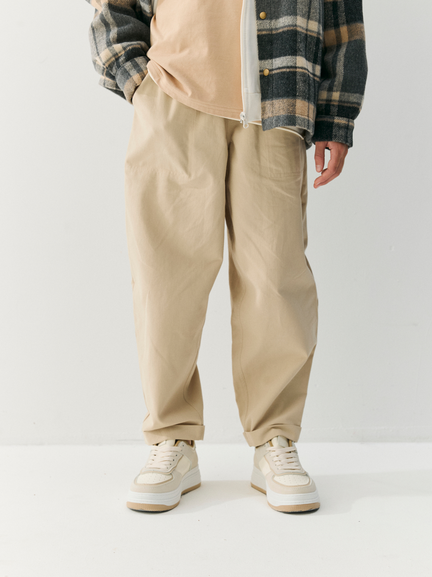 Брюки-бананы из мягкого габардина отлично сочетаются с футболками, толстовками, рубашками и худи.