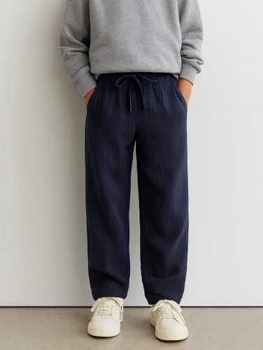 Брюки для мальчиков из ткани (муслин). Брюки длинные с классической линией талии. Силуэт прямой, брюки заужены немного к низу. Пояс цельнокроеный. Верхний срез брюк