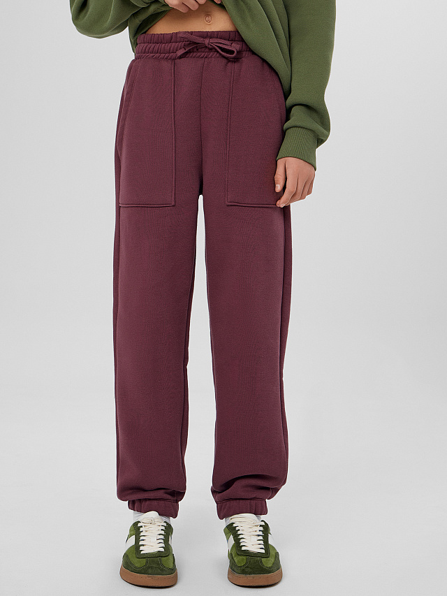 Посадка средняя. Пояс отрезной, внутрь пояса застрочена эластичная тесьма и шнур. По поясу идут две декоративные строчки. Боковые швы перенесены вперед. На передних деталях накладные карманы с наклонным входом от боковых швов. По низу изделия внутрь застрочена эластичная тесьма.
