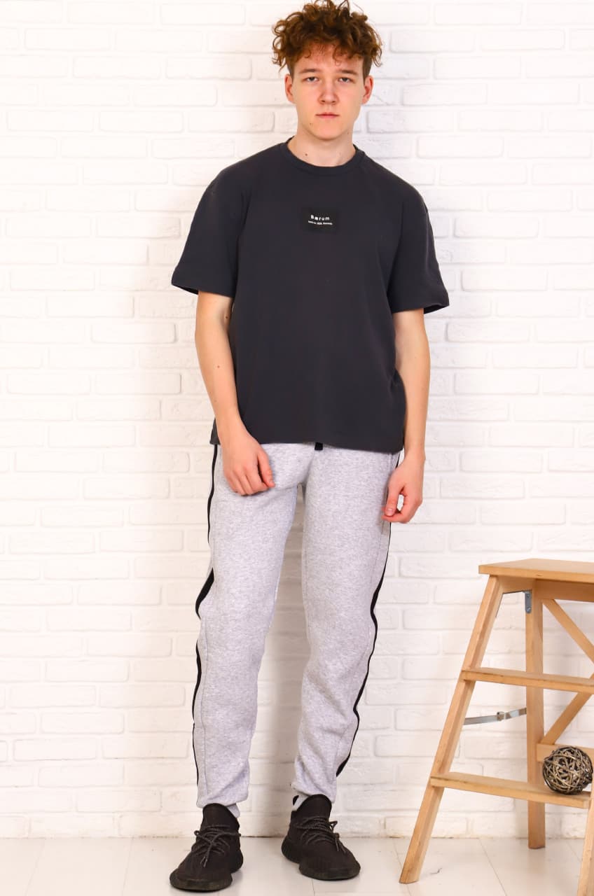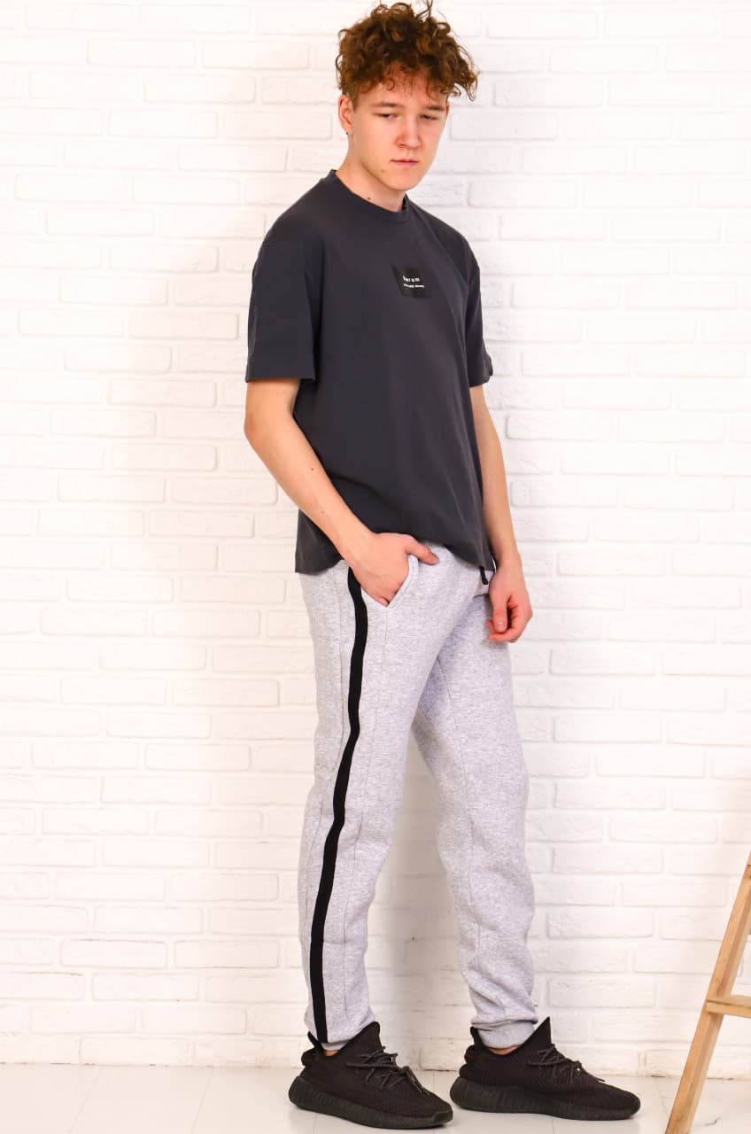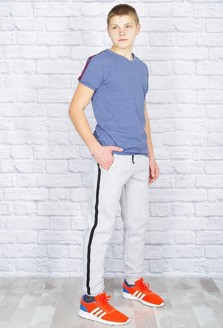 Модная и стильная модель зауженных спортивных брюк из тёплого супер-футера с начёсом, плотностью 320-350 г/м2. Манжеты снизу из эластичной рибаны, пояс на широкой резинке и со шнурком, удобные боковые карманы, по бокам широкая вставка с контрастной тесьмой.