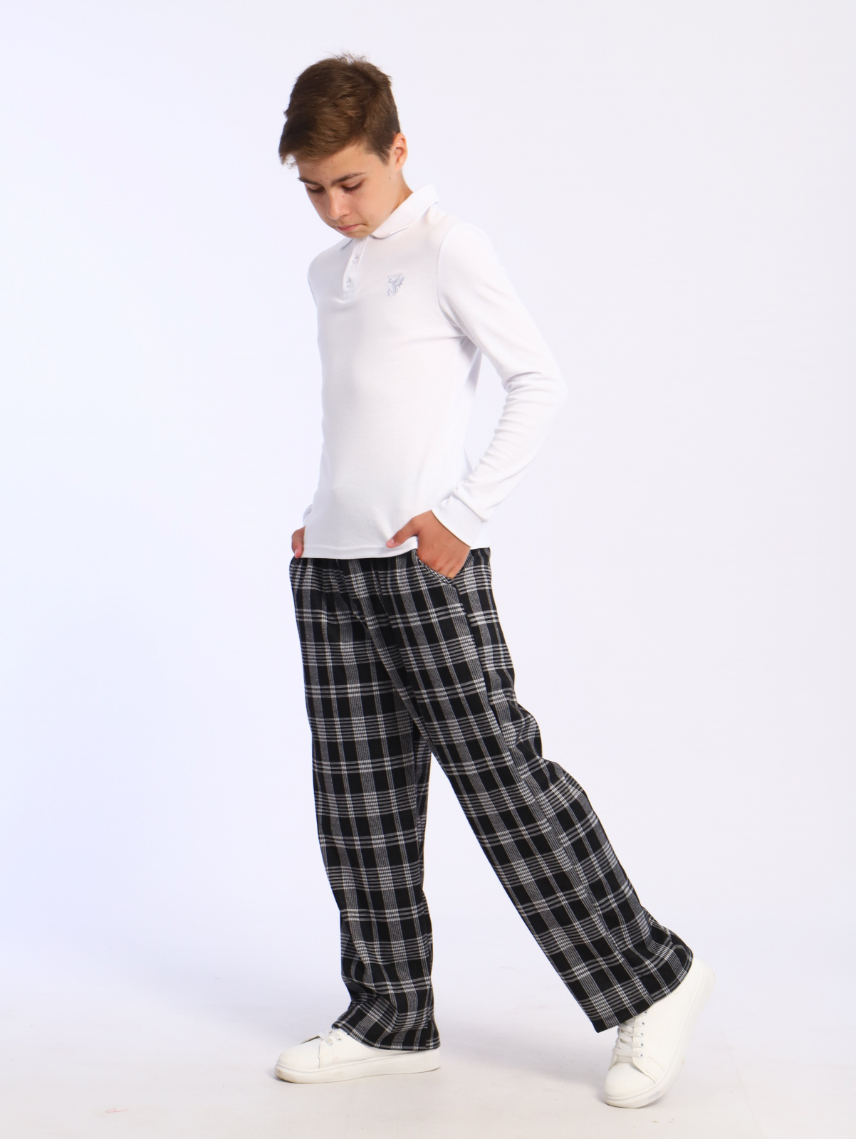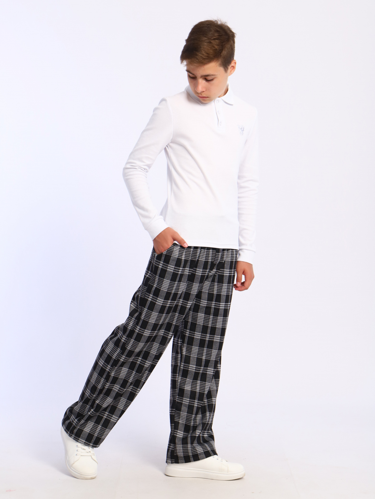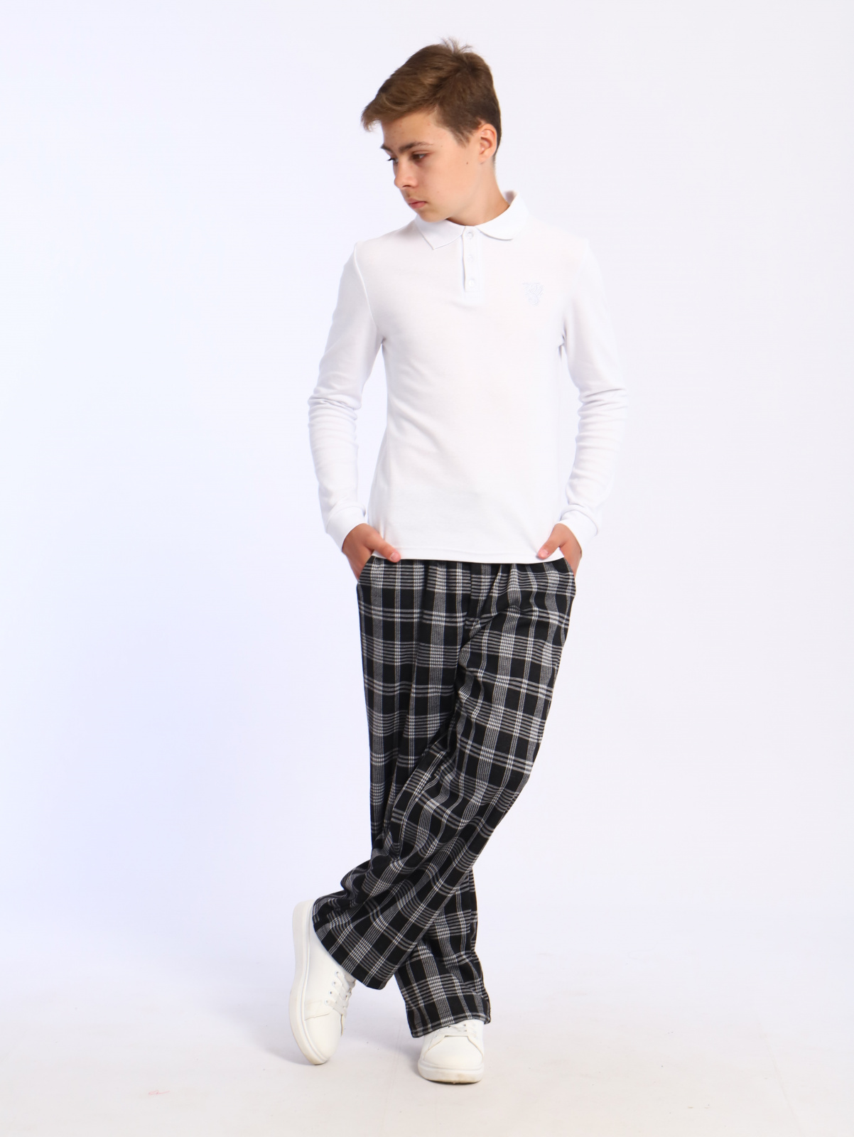 Простые, классические брюки в клетку в комплекте с рубашкой на мальчика или водолазкой для подростков помогут создать новый и неповторимый стильный образ. Так же можно сочетать с футболкой, майкой и лонгсливом.