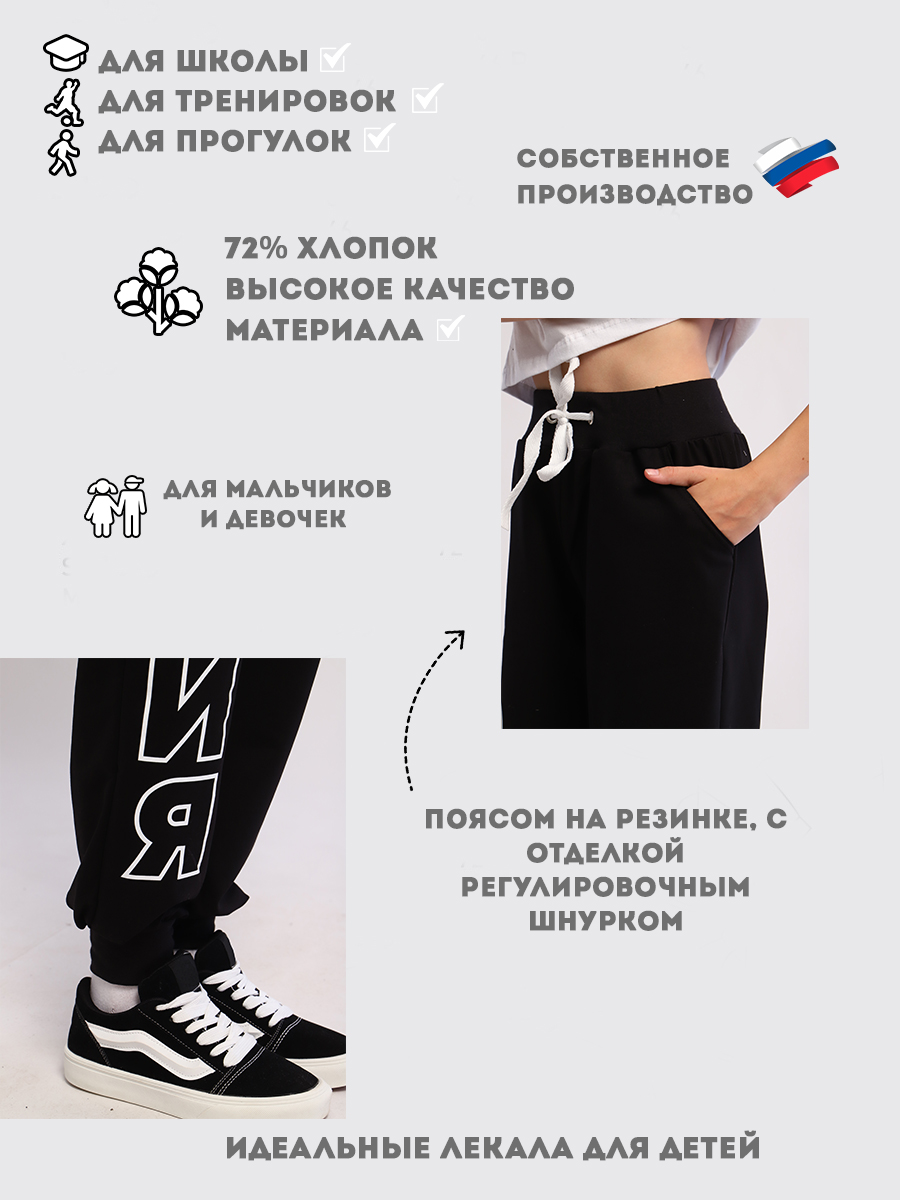 Хлопок 72 % обеспечивает комфорт и приятен для тела. Дополнительные 20 % полиэстера и 8% лайкры дают эластичность и устойчивость к износу. Брюки подойдут для физкультуры, прогулок или в подарок. Классический черный цвет делает их универсальными и легко сочетаемыми с другой одеждой, как часть костюма. Спортивки в сочетание с футболкой, майкой, водолазкой, лонгсливом, толстовкой, олимпийкой, свитшотом, легким худи подойдут для школы, занятий спортом, секций, кружков, путешествий, походов, экскурсий, туризма, тренировок, бега, повседневных прогулок, дома, отдыха, для подарка.