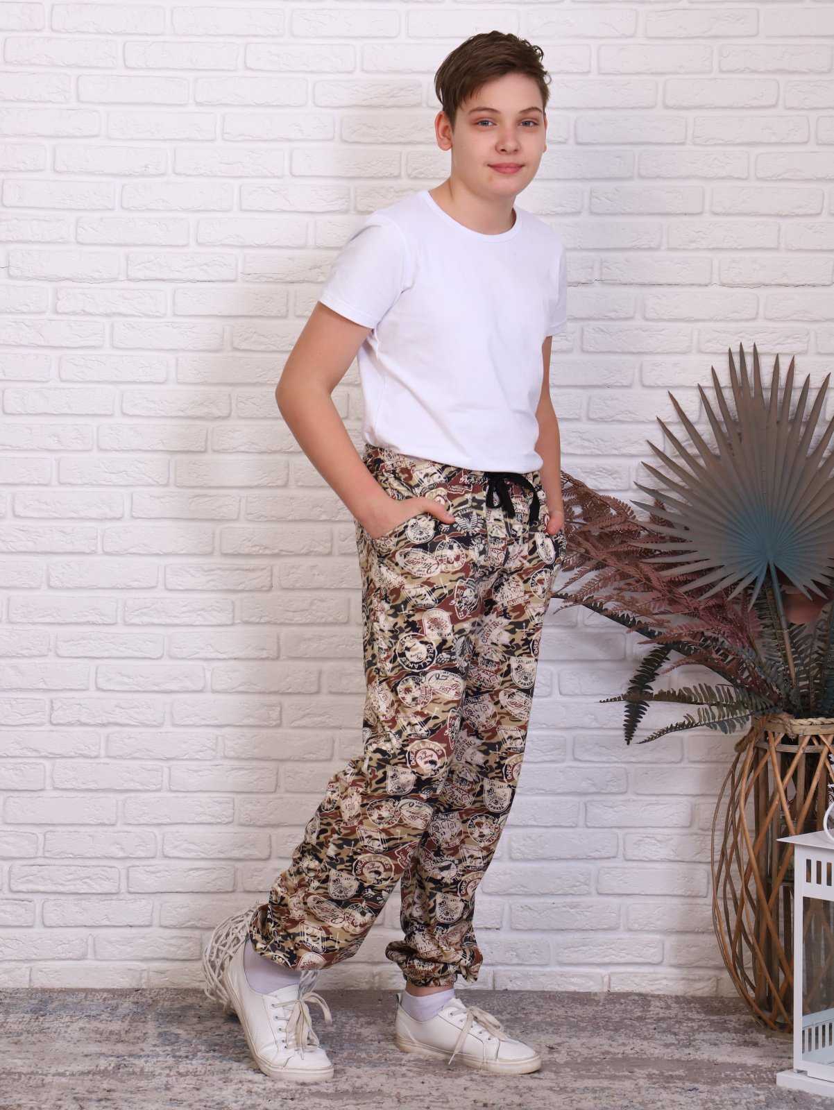 Подростковые брючки с высокой посадкой по талии с регулируемым шнурком с боковыми карманами во швах.