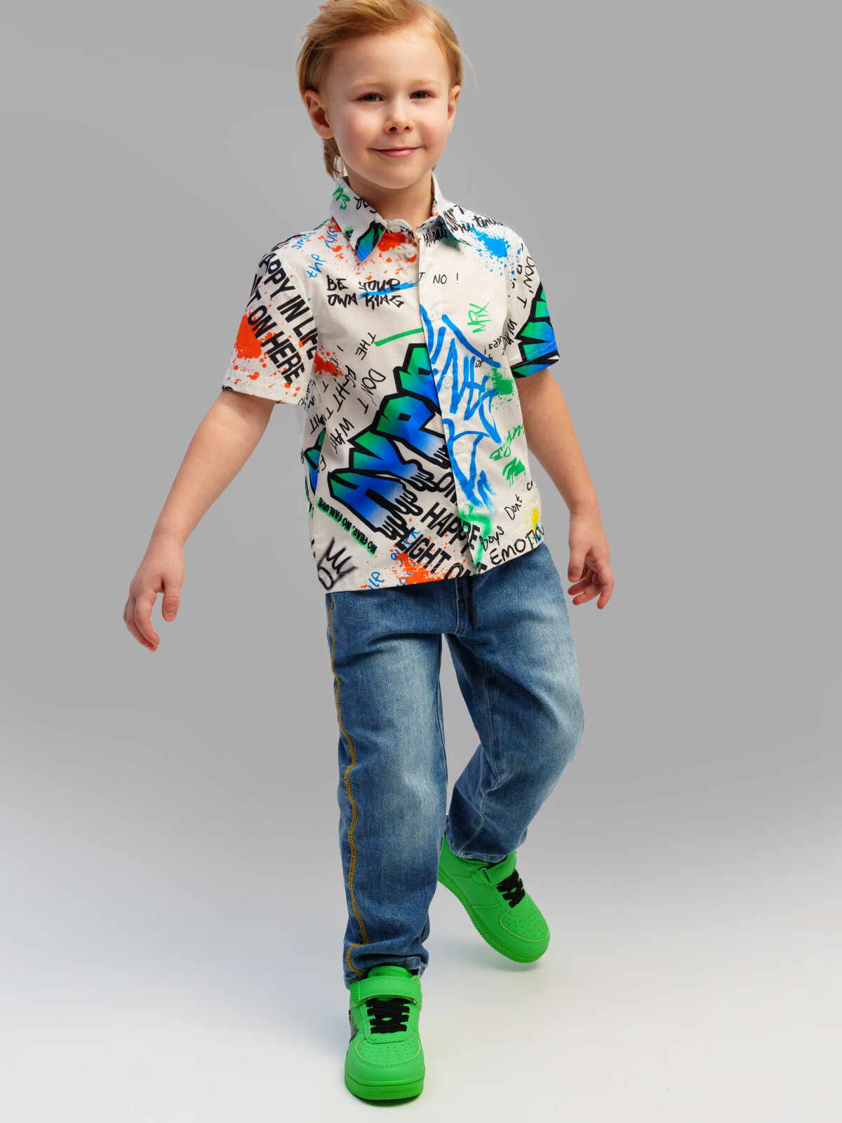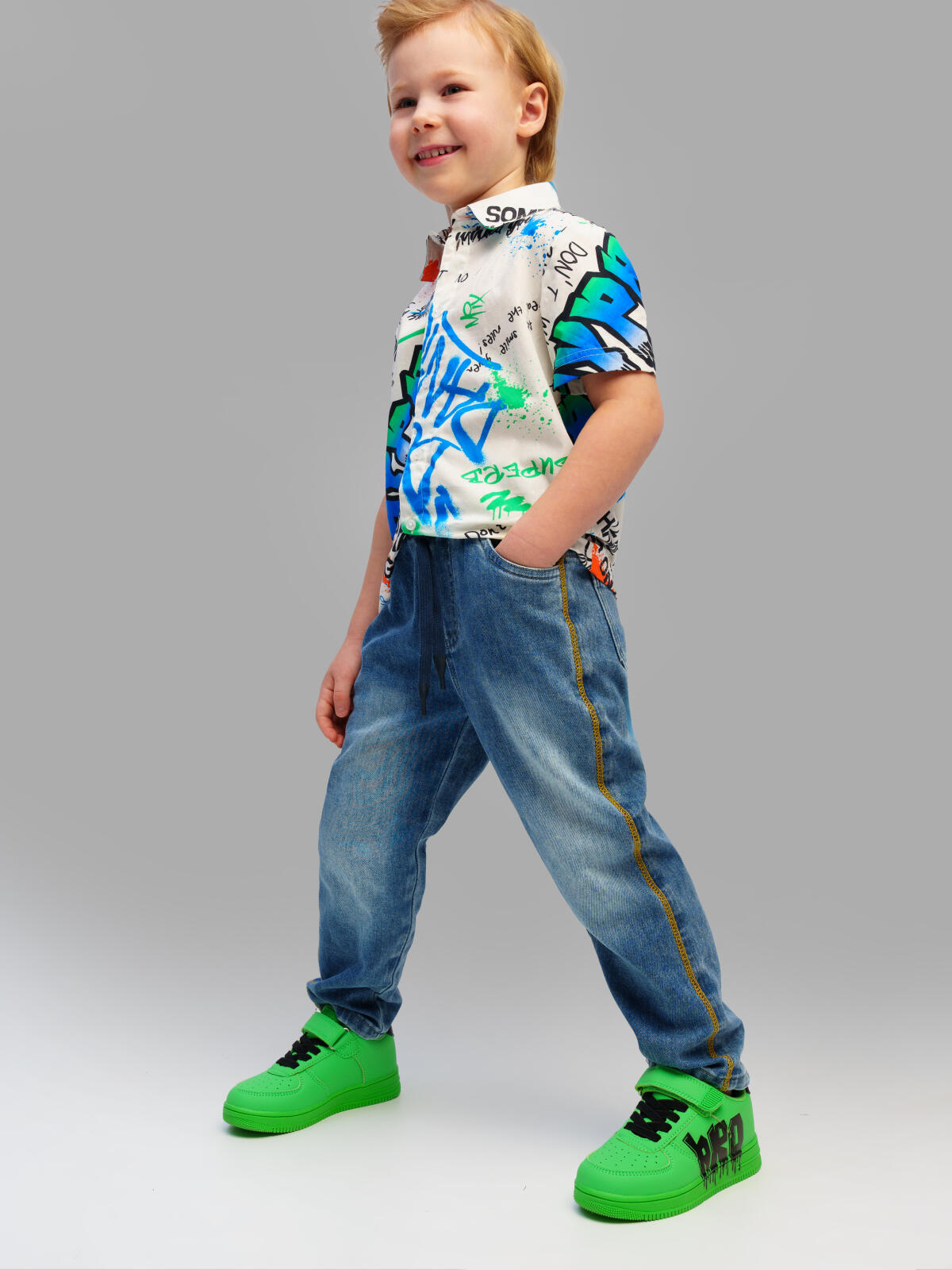 Джинсы детские для мальчика. BAGGY FIT - модный расслабленный крой. Средняя посадка. Джинсы на резинке со шнурком. 5 карманов. Приятная на ощупь ткань с добавлением вискозы. Модель выполнена из качественного и плотного текстиля.