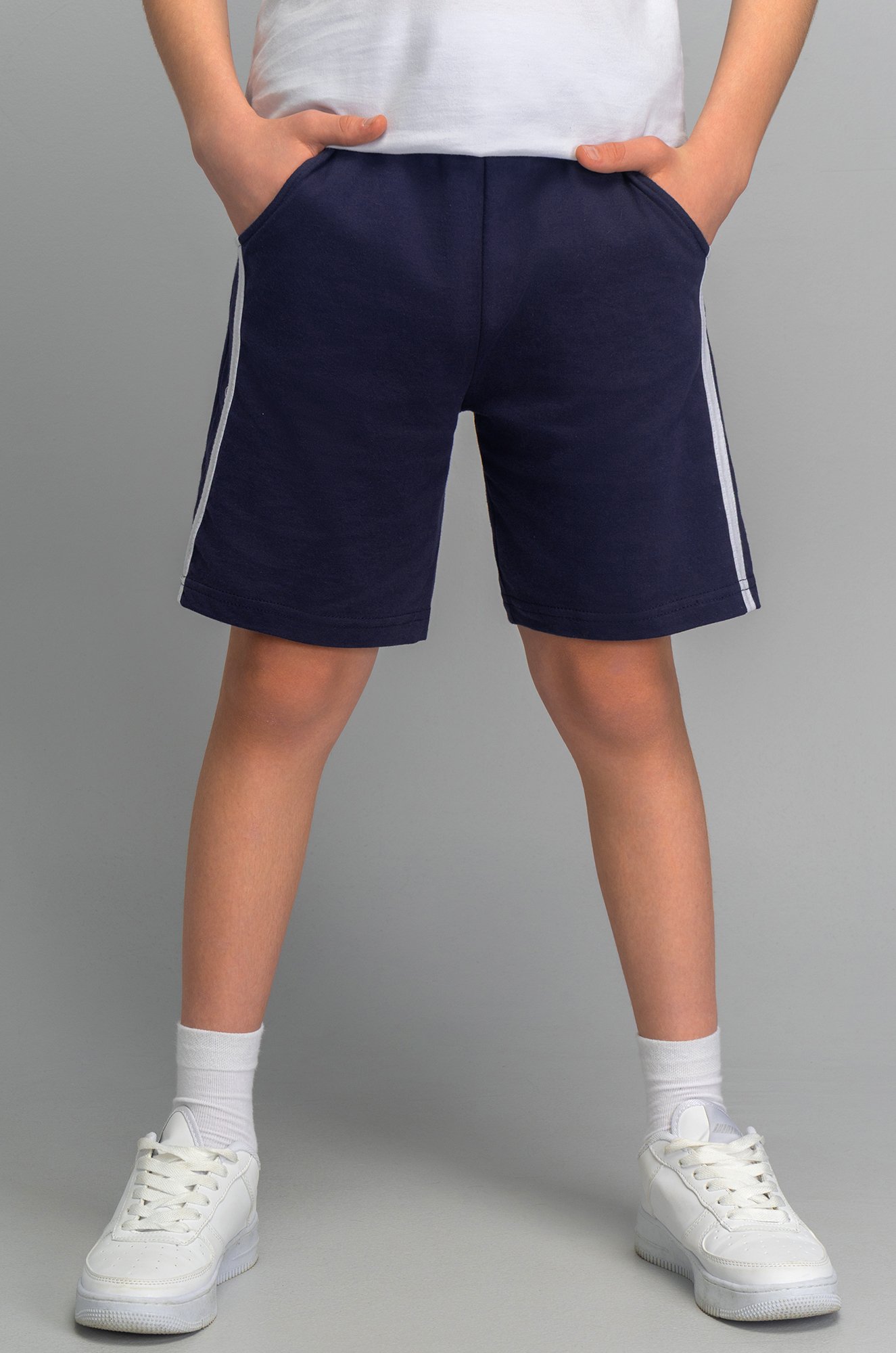 Детск..показатьие спортивные шорты для мальчиков и мальчиков-подростков выполнены из натурального 100% хлопка. Прямой крой, практичные карманы, мягкая резинка – каждая деталь создана для комфорта ребенка. Базовые синие шорты для детей украшены белыми лампасами по бокам.