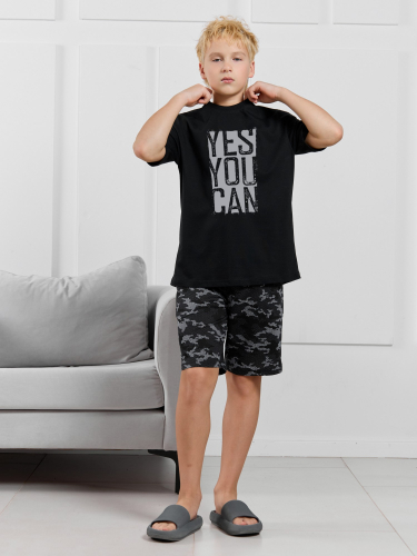 Костюмдля мальчика, состоящий из футболки и брюк. Футболка однотонная с принтом на груди; модель свободная, со спущенной линией плеч, овальным вырезом горловины. Брюки из полотна с набивным рисунком эксклюзивного дизайна, прямые, с боковыми карманами с обтачными входами, на притачном поясе с отстроченной эластичной тесьмой.