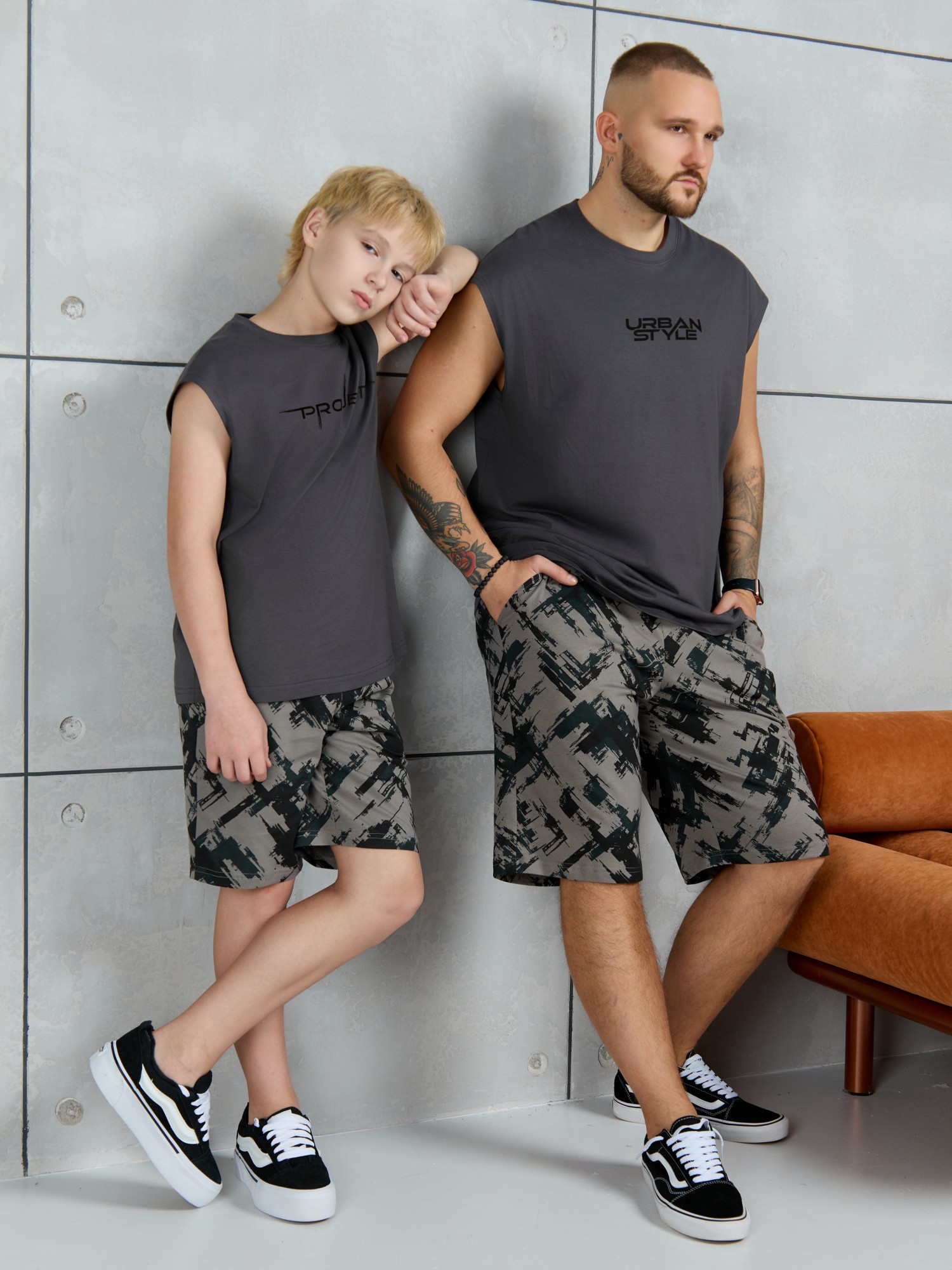 Костюм для мальчика, состоящий из майки и шорт. Майка однотонная с принтом на груди; модель свободная, со спущенной линией плеч и углубленной проймой. Шорты из полотна с набивным рисунком эксклюзивного дизайна, с боковыми карманами с обтачными входами, на притачном поясе с отстроченной эластичной тесьмой.