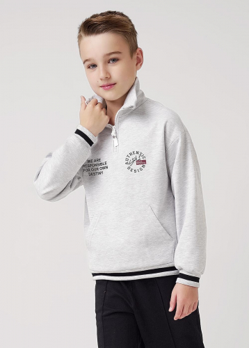 "Описание: Стильная толстовка из мягкого футера- идеальное дополнение к вашему гардеробу! Модель с воротником- стойкой дополнена короткой молнией и классным трендовым принтом. Манжеты и пояс с контрастной отделкой- полосками.