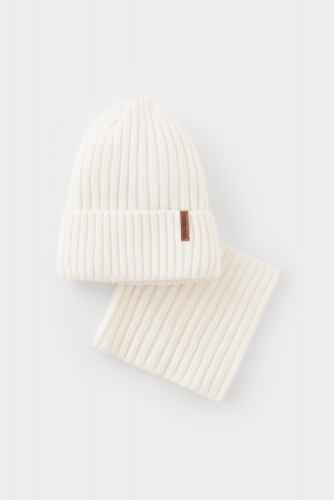 Комплект детский: шапка и снуд из полушерсти. Тёплая вязаная шапка с отворотом на подкладе из флиса. Украшена нашивкой из искусственной кожи. Узкий снуд без оборотов вокруг шеи. Изделие сохраняет форму и стойкий цвет после многочисленных стирок.