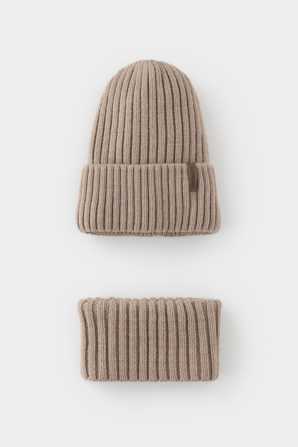 Комплект детский: шапка и снуд из полушерсти. Тёплая вязаная шапка с отворотом на подкладе из флиса. Украшена нашивкой из искусственной кожи. Узкий снуд без оборотов вокруг шеи. Изделие сохраняет форму и стойкий цвет после многочисленных стирок.