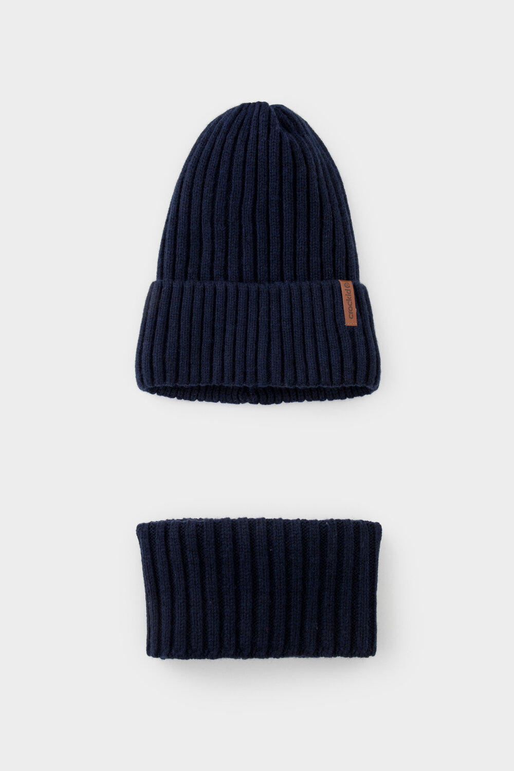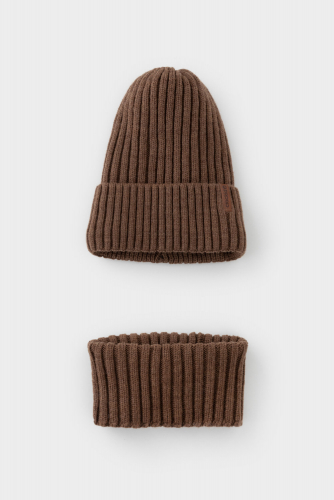 Комплект детский: шапка и снуд из полушерсти. Тёплая вязаная шапка с отворотом на подкладе из флиса. Украшена нашивкой из искусственной кожи. Узкий снуд без отворотов вокруг шеи. Изделие сохраняет форму и стойкий цвет после многочисленных стирок.