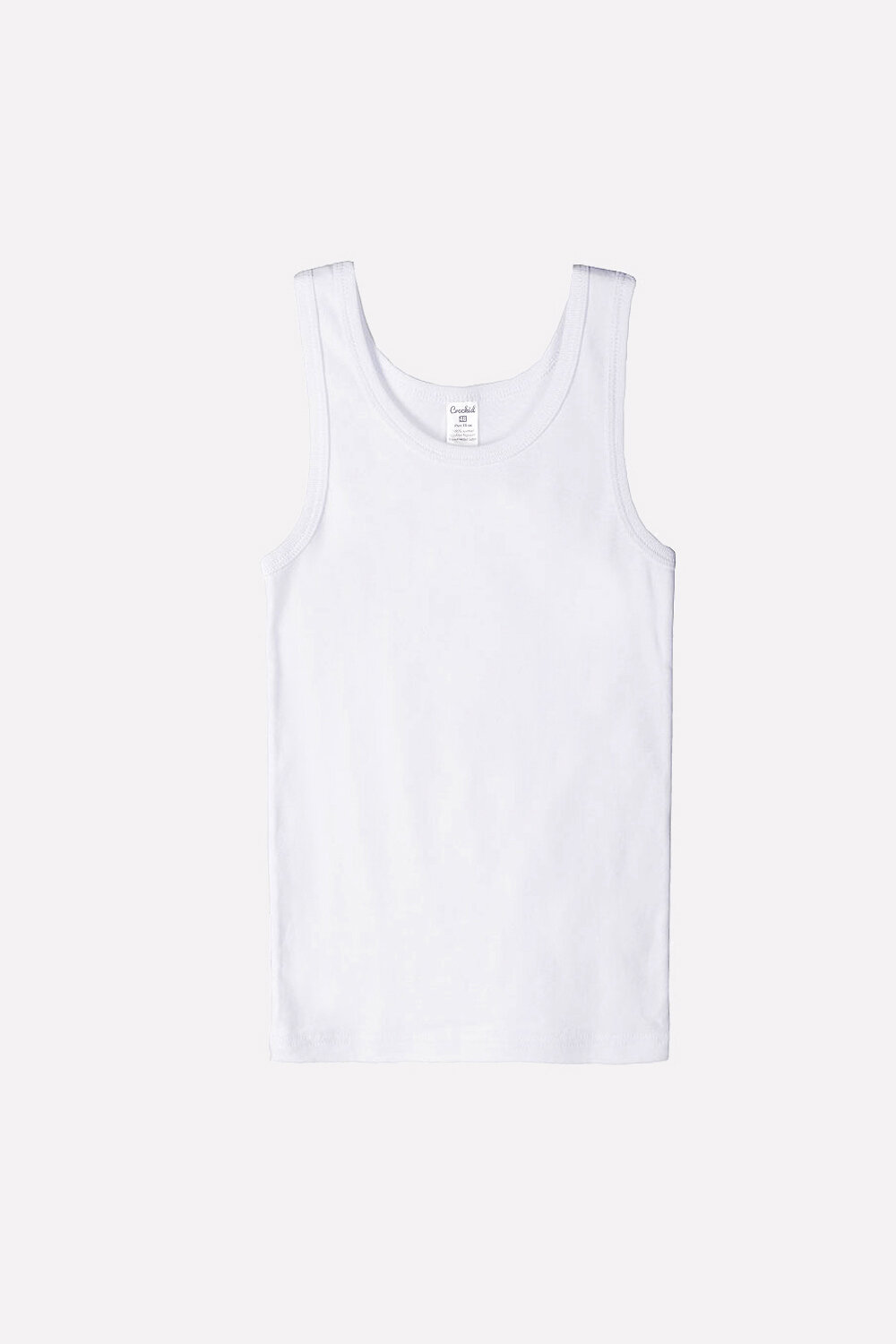 Бесшовная майка для мальчика из однотонного трикотажного хлопка. Отсутствие боковых швов обеспечивает комфорт при ношении.