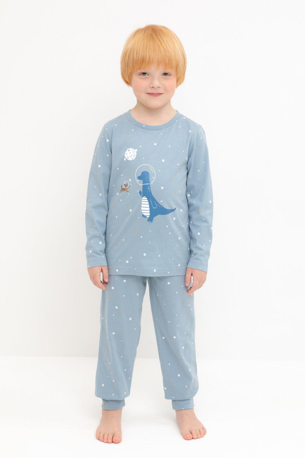 Трикотажная пижама из натурального хлопка. Джемпер с длинными втачными рукавами и брюки с эластичной резинкой в поясе. Мягкие манжеты по низу брюк. Оригинальные набивка и принт выполнены из стойких гипоаллергенных текстильных красителей. Изделие сохраняет цвет и форму после многократных стирок. Все трикотажные полотна производятся в соответсвии с нормами швейцарского сертификата ЭкоТекс.