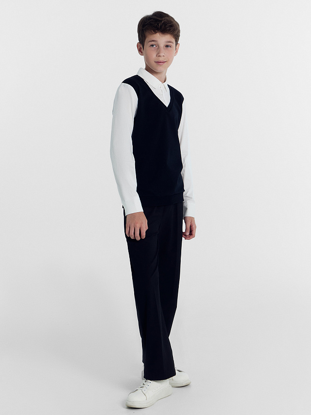 Стильный джемпер прямого силуэта для мальчиков. Вырез V-образной формы, с декоративной текстильной манишкой на пуговицах и воротником-стойкой. Рукава с манжетами и застежкой на пуговицу. Джемпер имитирует рубашку, поддетую под жилет, и отлично подходит для школы!