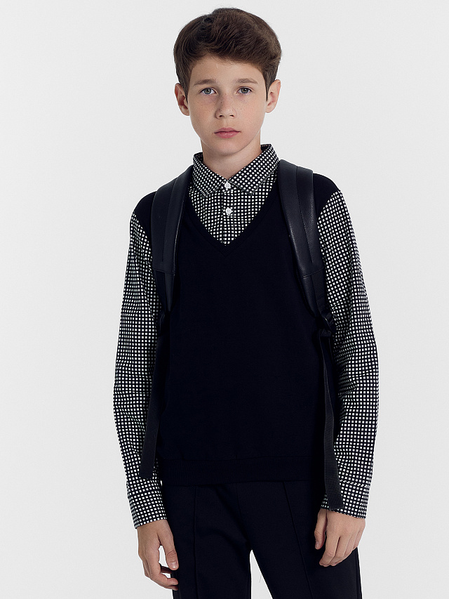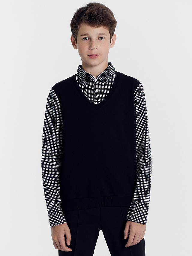 Джемпер прямого силуэта для мальчиков имеет классический дизайн, идеально подходящий для школьного гардероба. Он выполнен из высококачественного трикотажного материала, который приятен на ощупь и удобен в носке. Джемпер имеет удобный вырез V-образной формы, который придает ему элегантности и стиля. На груди расположена декоративная текстильная манишка, украшенная пуговицами. Придает джемперу акцент и интересный внешний вид. Воротник-стойка делает его еще более элегантным. Рукава изделия на манжетах. Особенностью данного джемпера является его имитация рубашки, которая поддета под жилет. Этот дизайн дает возможность создать элегантный и аккуратный образ, идеально подходящий для школьных будней. Рекомендуем эту стильную новинку!