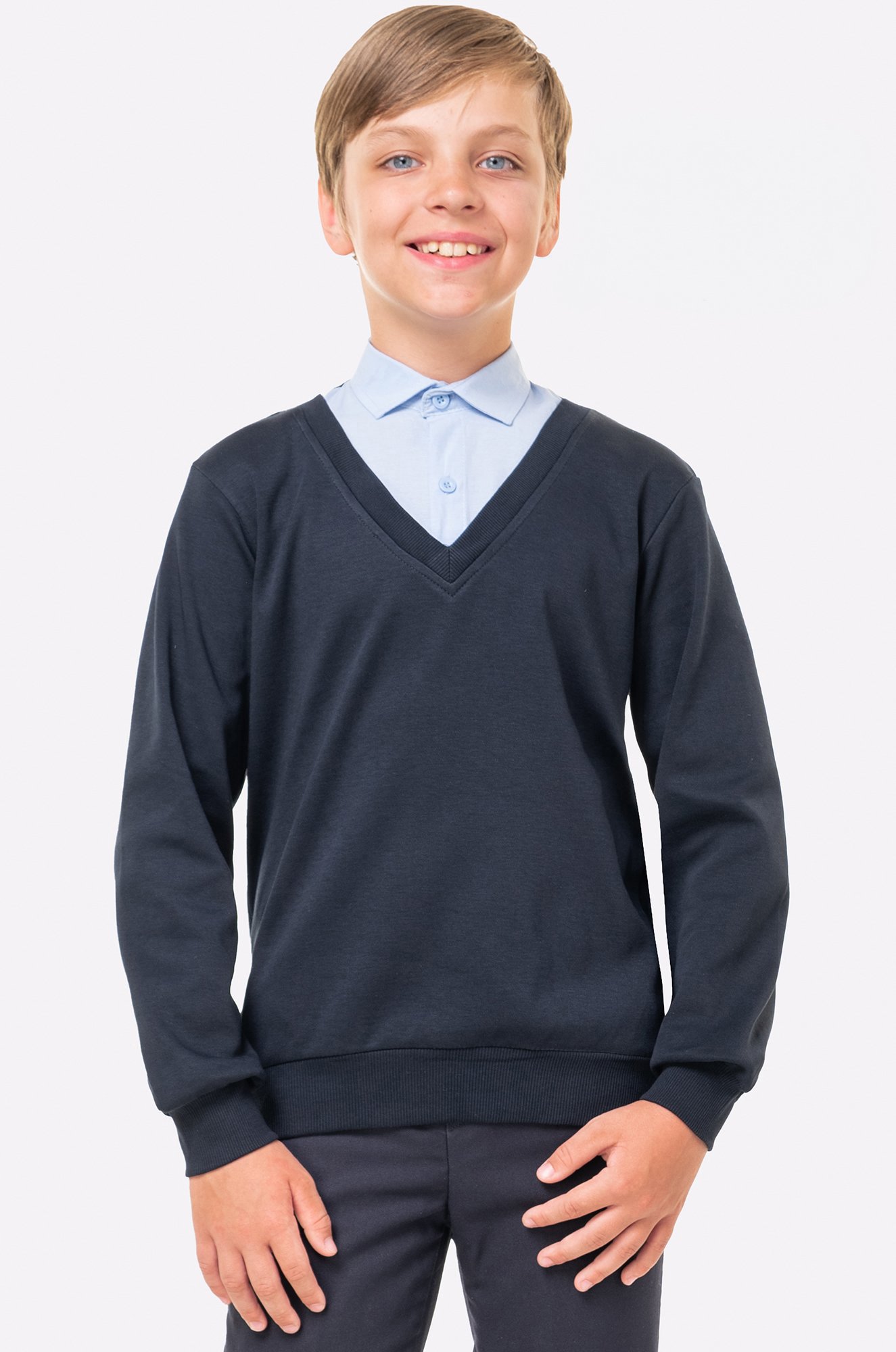 Джемпер с имитацией голубой рубашки на пуговицах – идеальный выбор для школьных будней.