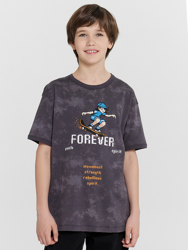 Джемпер для мальчиков свободного силуэта. Рукава втачные короткие. Горловина круглой формы. Горловина и низы рукава окантованы рибаной. Низ футболки обработан швом вподгибку на 2-ух игольной плоскошовной машине.