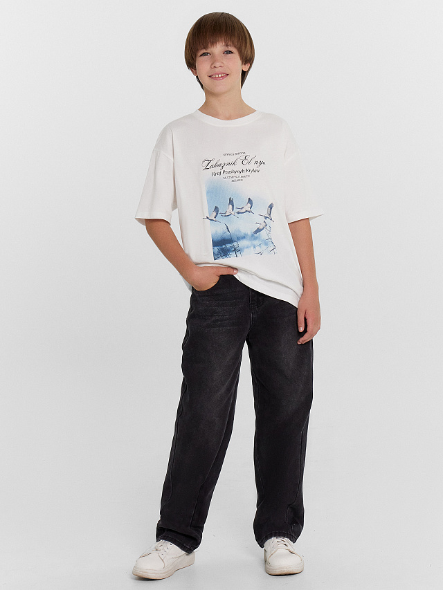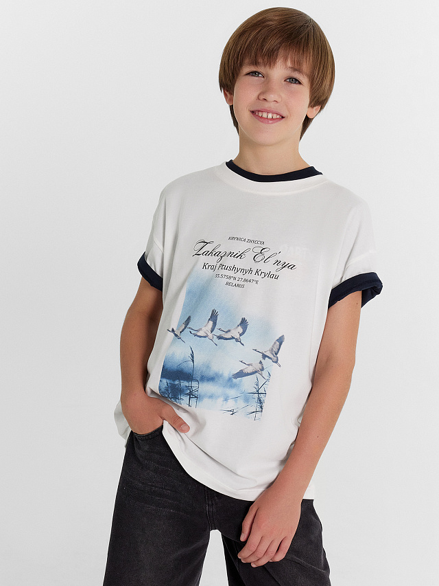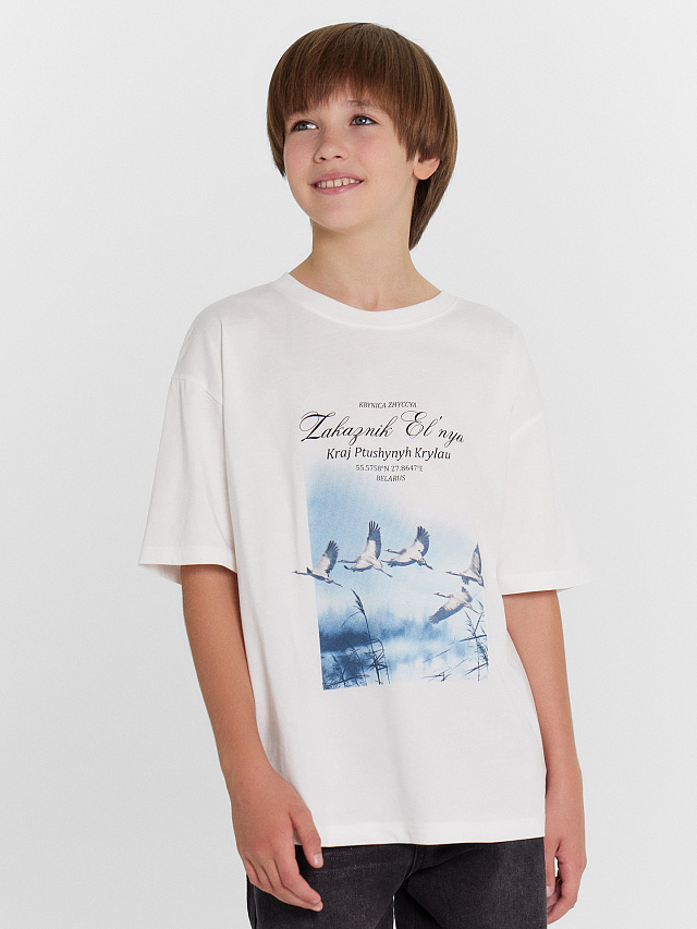 Футболка для мальчиков из высококачественного хлопка с печатью в виде журавлей и надписи "Krynica zhyccya - Zakaзnik El’nya / Источник жизни - заказник Ельня". Силуэт прямой, перед и спинка без швов и рельефов. Длина до середины бедра. Рукава короткие, горловина круглой формы. Ткань футболки мягкая, легкая и эластичная, не сковывает движения, комфортная в носке, отлично подходит для жарких летних дней и любых активностей. Подойдет для детского сада, игр, занятий спортом, прогулок и путешествий. Базовый элемент гардероба, который отлично сочетается с другой одеждой. В коллекции есть разные цвета, футболки подойдут как для высоких, так и для невысоких мальчиков. К футболке можно подобрать стильный низ из линейки детской одежды для мальчиков. Рекомендуем!