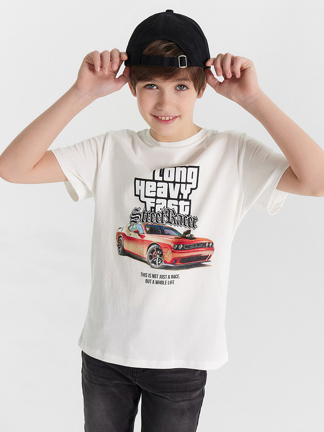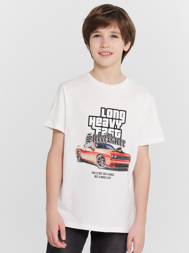 Футболка для мальчиков белая с принтом и надписью "long heavy fast"