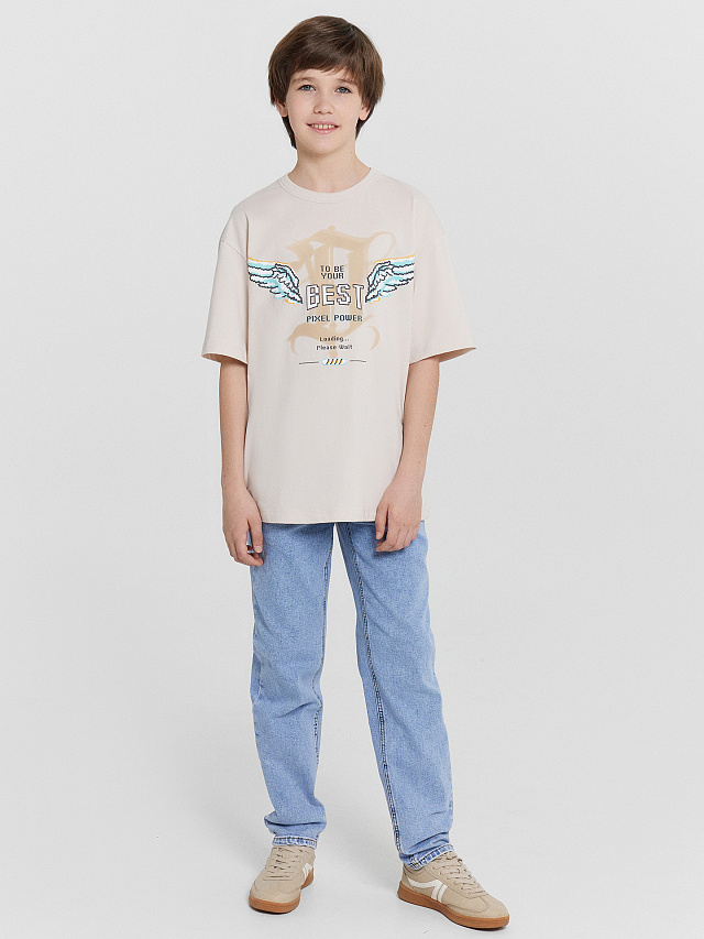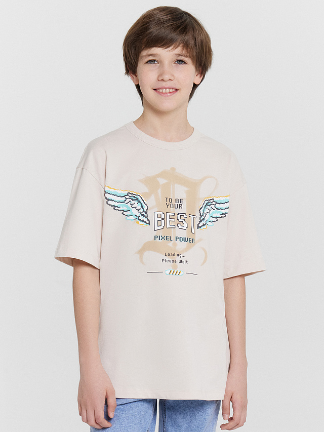 Футболка для мальчиков бежевая с принтом и надписью "best pixel power"