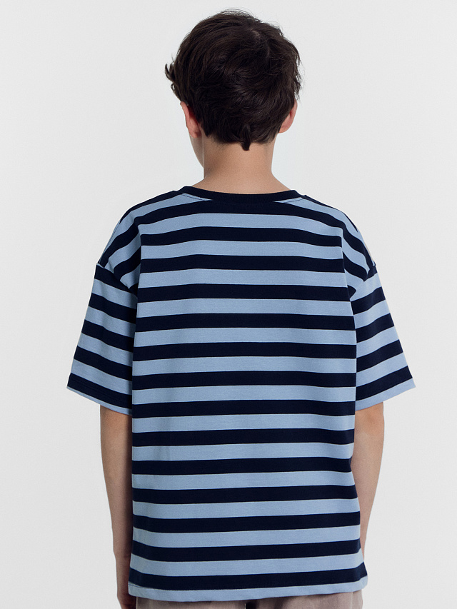 Футболка свободного силуэта. Перед и спинка цельнокроенные. Длина до середины бедра. Рукав втачной, короткий, линия плеча спущена. Горловина круглой формы, обтачка из трикотажного полотна рибаны 2*2. Низ изделия и рукваов обработан на 2-х игольной плоскошовной машине швом в подгибку.