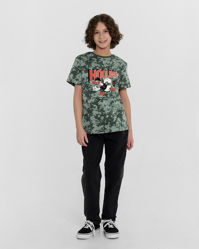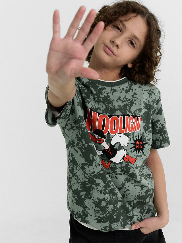 Футболка для мальчиков зеленая в стиле миллитари с принтом и надписью "Hooligan"