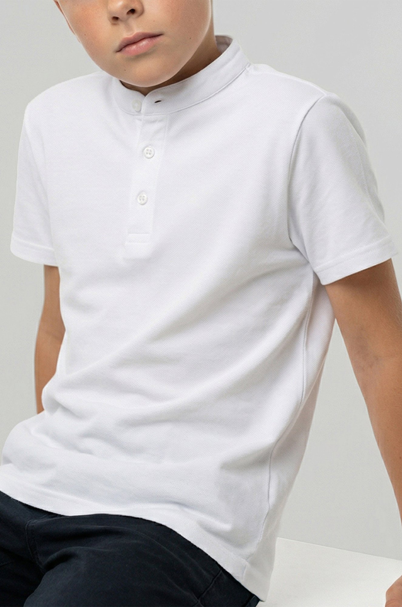 Белая футболка поло создана для мальчика и подростков школьников, ценящих классический стиль! Детская футболка прямого кроя обеспечивает свободу движений. Застёжка на пуговицы и воротник стойка выглядят оригинально и стильно.