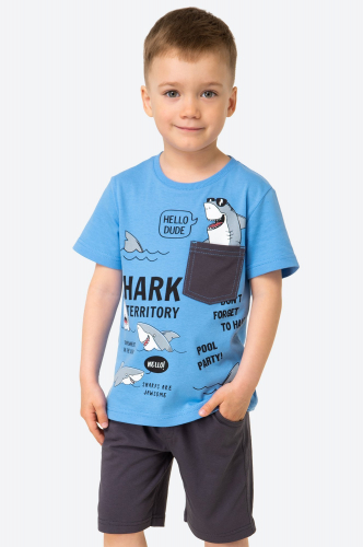 В наборе серые шорты и голубая футболка с принтом забавные Акулы. Эластичная резинка шортиков мягко прилегает, надежно удерживает и дарит удобную посадку. У футболки имеется нагрудный карман из контрастной ткани. аккуратные швы не ощущаются в течение дня. Благодаря комфортному крою костюм из трикотажа не стесняет движений даже самых озорных детишек!