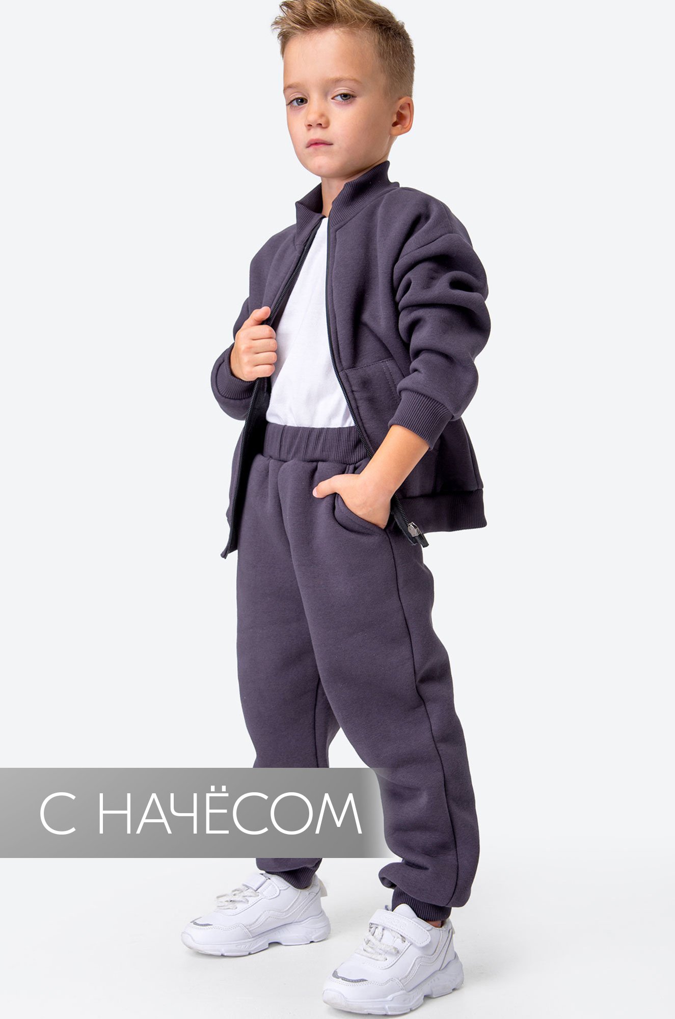 Теплый спортивный костюм с начесом для мальчика выполнен из плотного футера трехнитки. Толстовка с застежкой на молнию, удобные карманы, крой оверсайз и мягкий манжетный пояс делают детский костюм графитового цвета невероятно уютным. Однотонный зимний костюм двойка поможет создать крутые повседневные образы.
