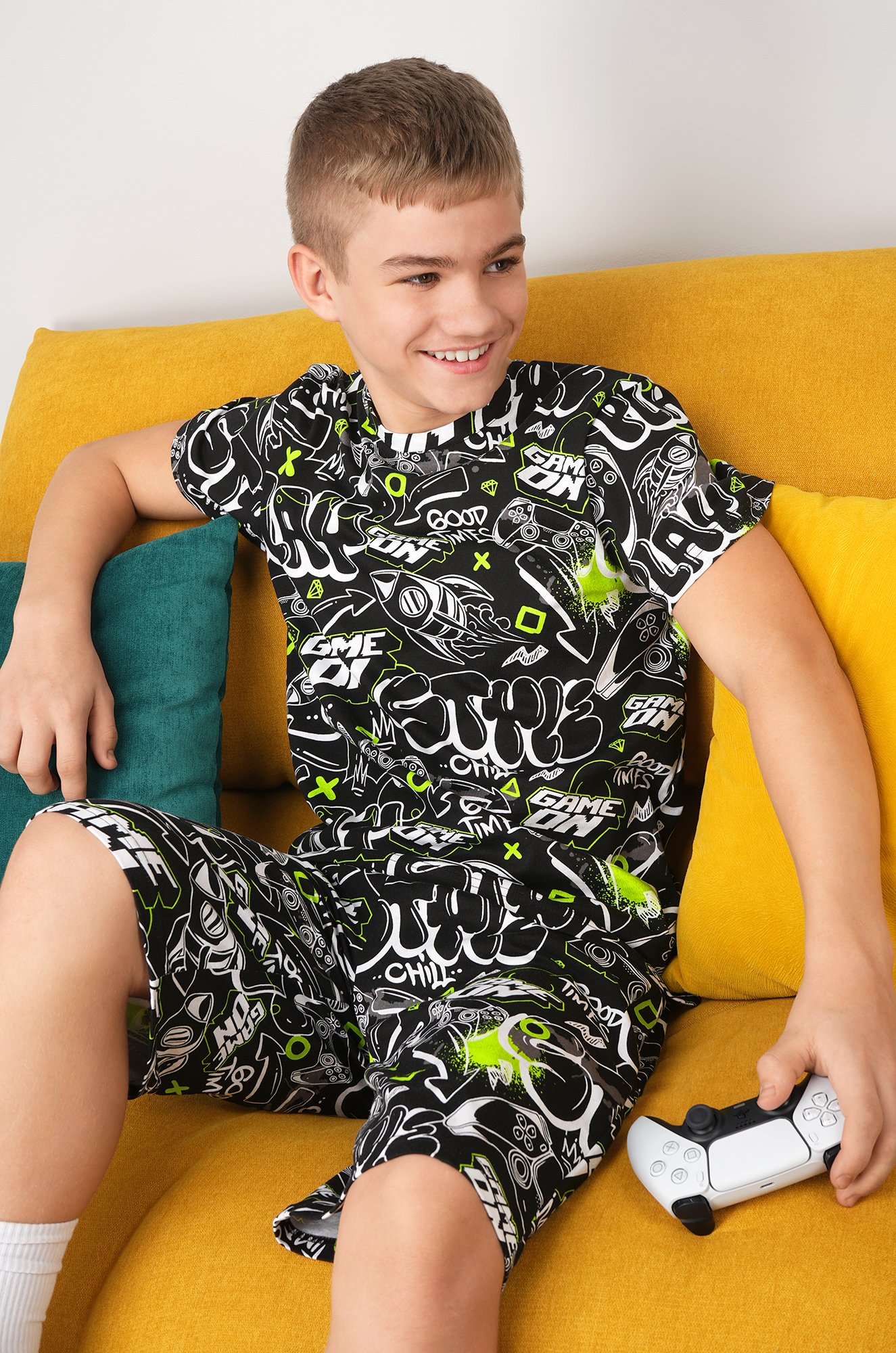 Детский костюм для мальчика подростка создан для уютного домашнего отдыха. Хлопковый комплект прекрасно подойдет как пижама с шортами. Костюм двойка идеален для детей, их комфорта и свободы движений.