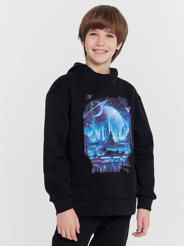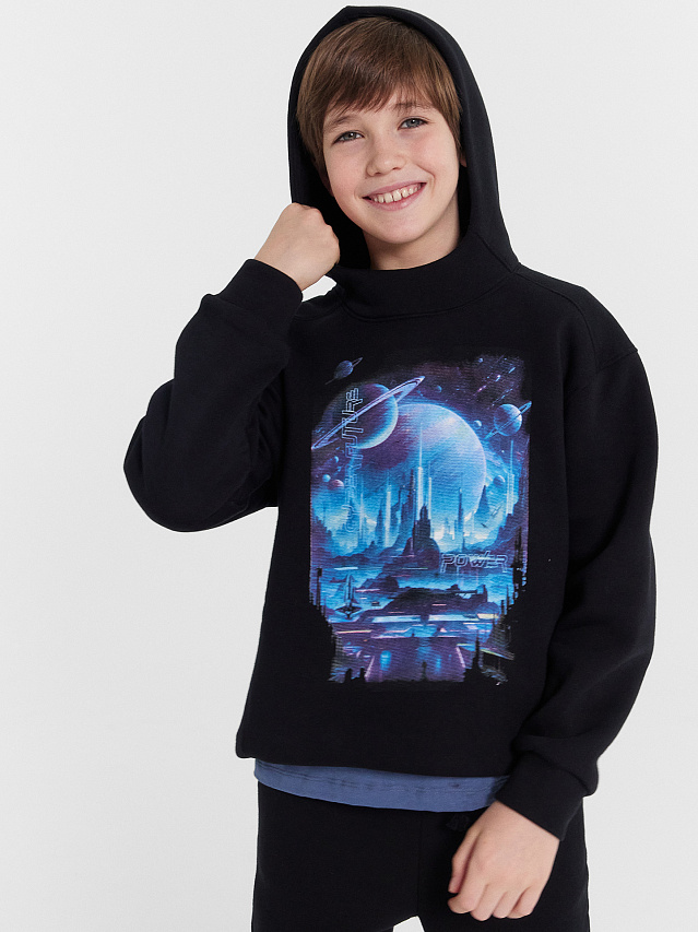 Анорак прямого силуэта с капюшоном. Капюшон на подкладке из основного полотна. Рукава длинные, втачные. Линия плеча спущена. Боковые и плечевые швы перенесены вперед. По спинке горизонтальное членение. По низу изделия и рукавов притачены пояс и манжеты из трикотажного полотна рибаны.