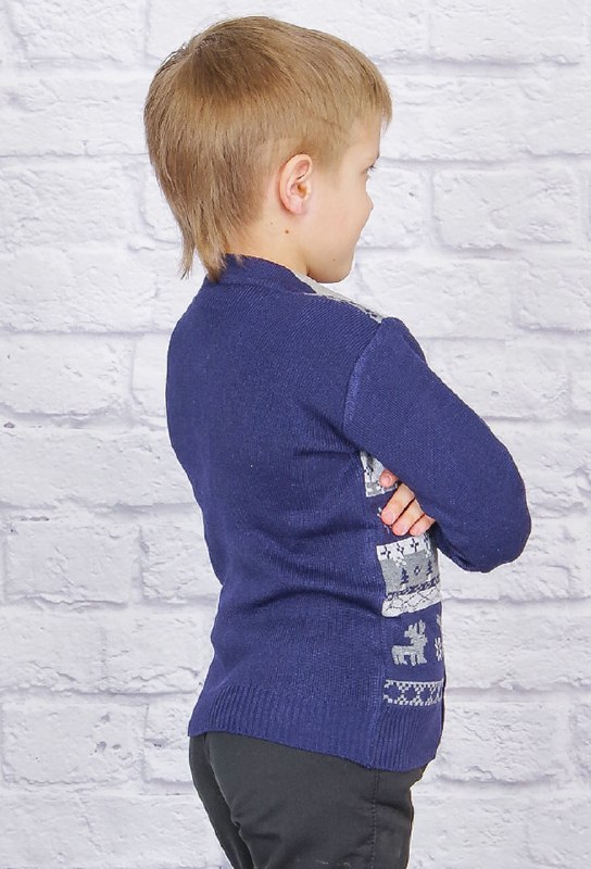 Стильный модный трикотажный кардиган на пуговицах для маленьких джентельменов. Модель с V-образным вырезом, рукава и спинка однотонные, перед декорирован орнаментом на зимнюю тематику. Кардиган подойдёт и к брюкам и к джинсам, это отличный вариант для школы.