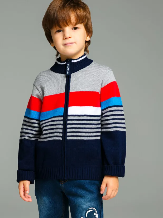 Кардиган из вязаного трикотажа. 50% вискоза. Вискоза отличается высокой гигроскопичностью - она впитывает влагу и отлично сохраняет тепло. Воротник-стойка, манжеты и низ изделия в рубчик.