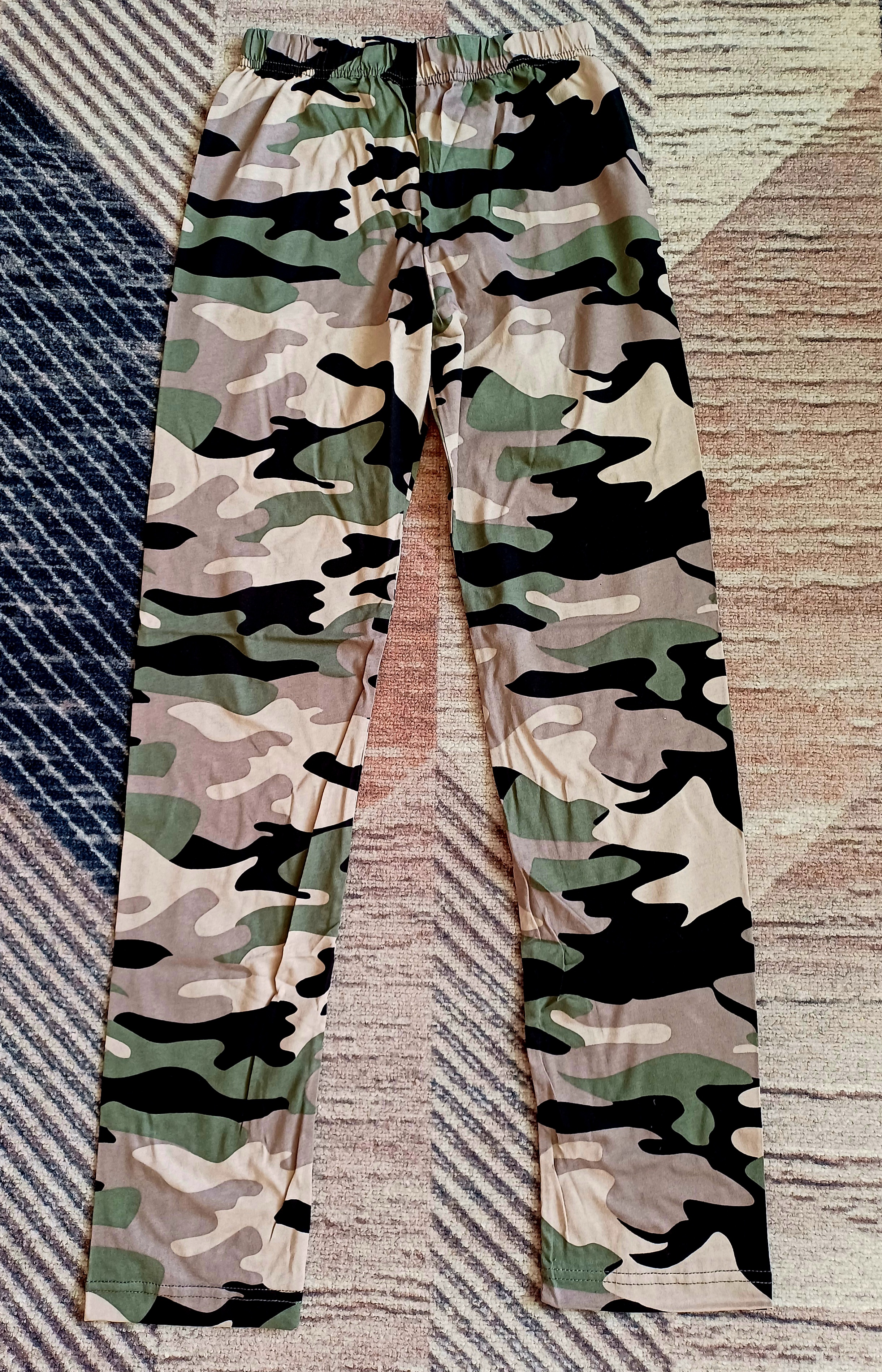 Брюки выполнены из кулирки, 100% хлопок (набивка камуфляж). Брюки без боковых швов, на резине по поясу.