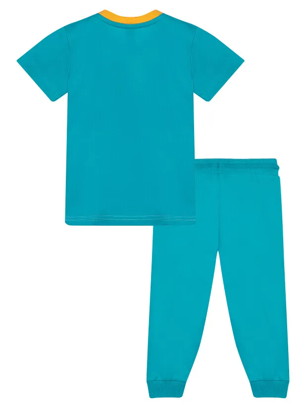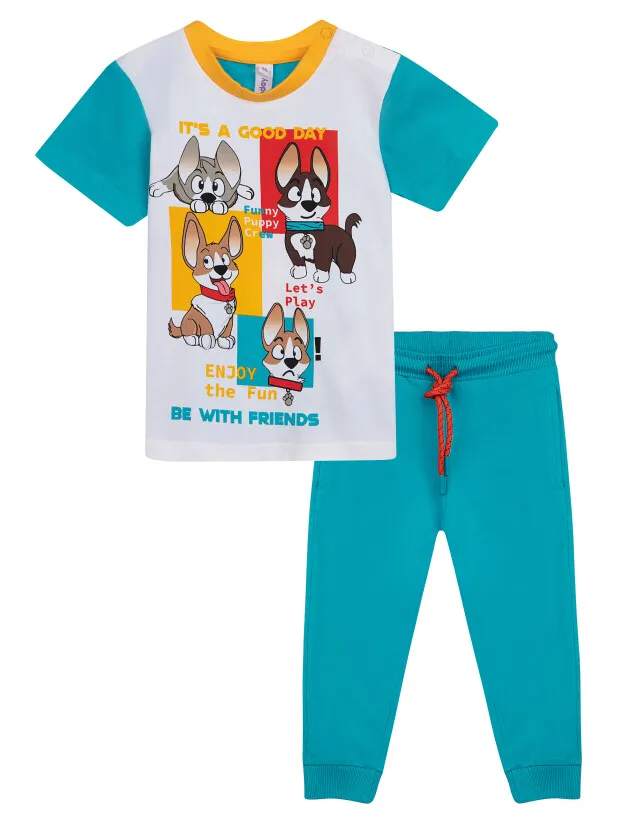 Комплект: футболка и брюки. Выполнен из качественного эластичного и приятного на ощупь трикотажа разных цветов. Посадка regular fit – классический крой. Застежка на кнопки на плече. Брюки с карманами в боковых швах. Эластичный пояс со шнурком и манжеты по низу изделия. Высокое содержание хлопка 95%. Благодаря наличию эластана в составе ткани изделие держит форму и меньше мнется.