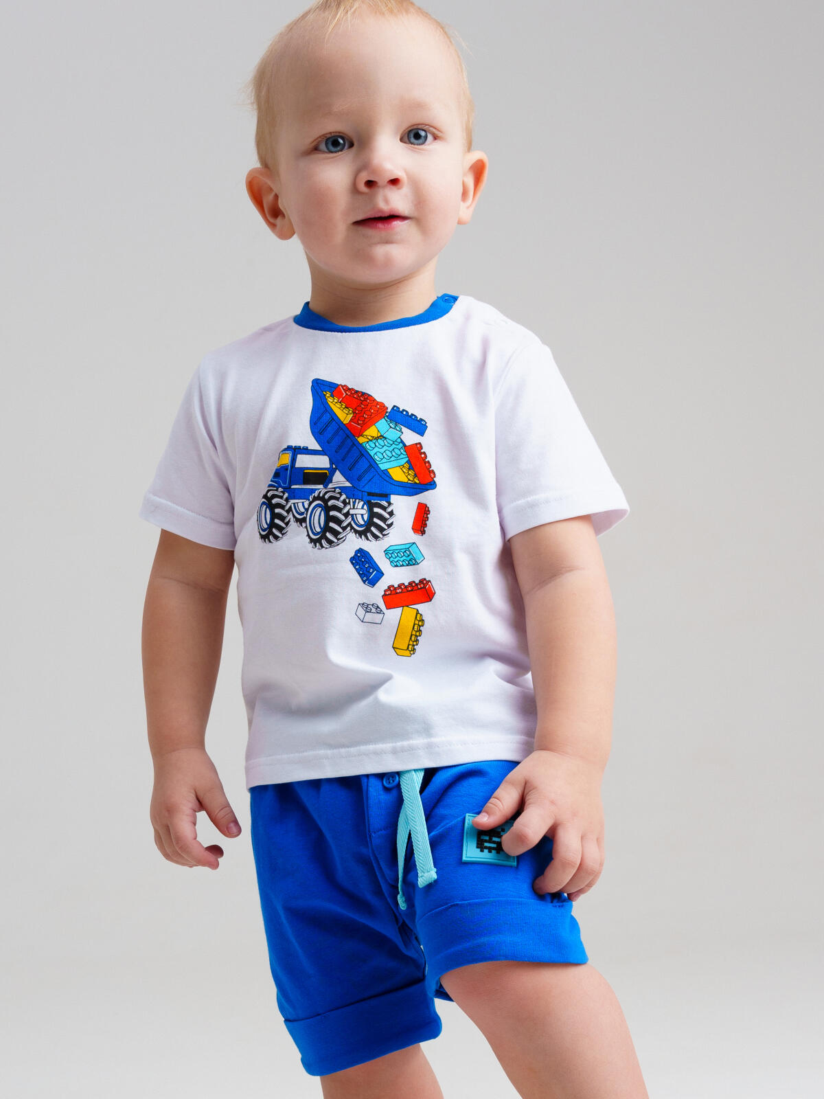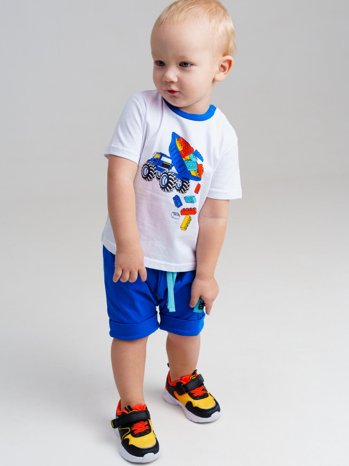 Костюм детский для мальчика. Комплект: футболка, шорты с высоким содержанием хлопка 95%. Благодаря наличию эластана в составе ткани изделие проще в уходе и держит форму. Шорты на резинке со шнурком. Застежка на плече на кнопки.