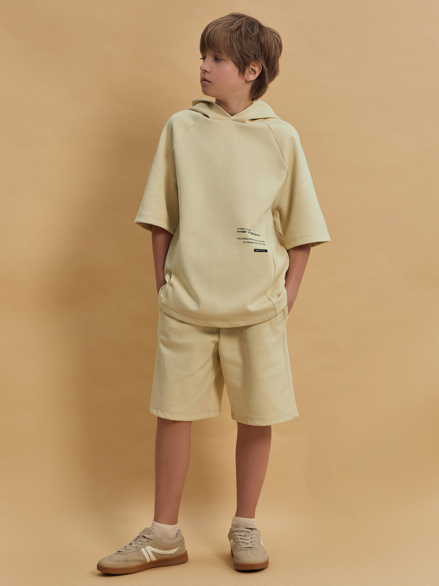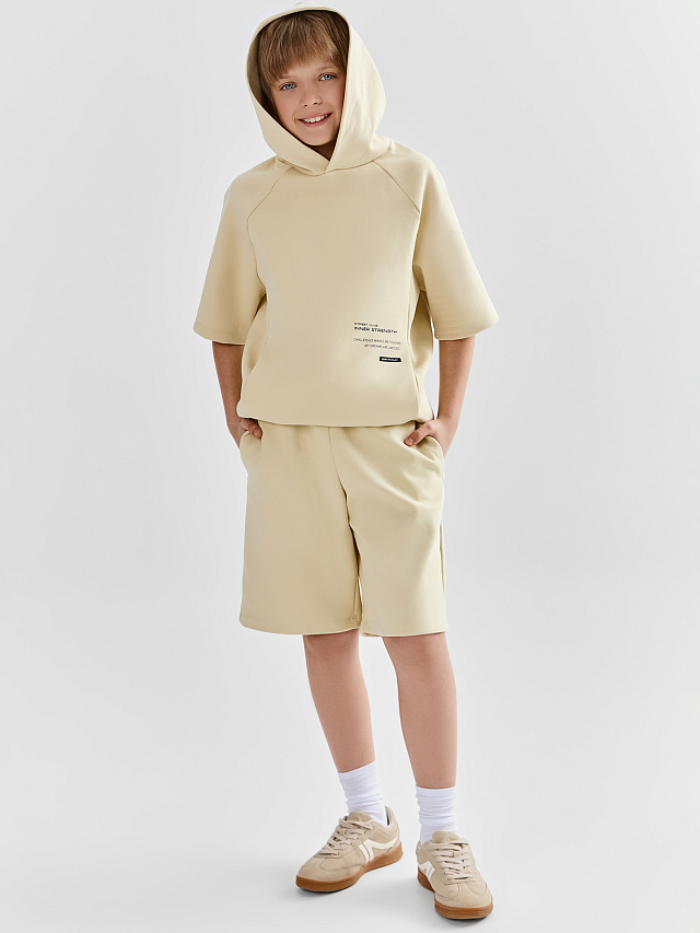 Бежевый комплект оверсайз для мальчика — стильная и удобная вещь для тёплых дней и активного отдыха. В него входят свободное худи с коротким рукавом и удобные шорты выше колена.